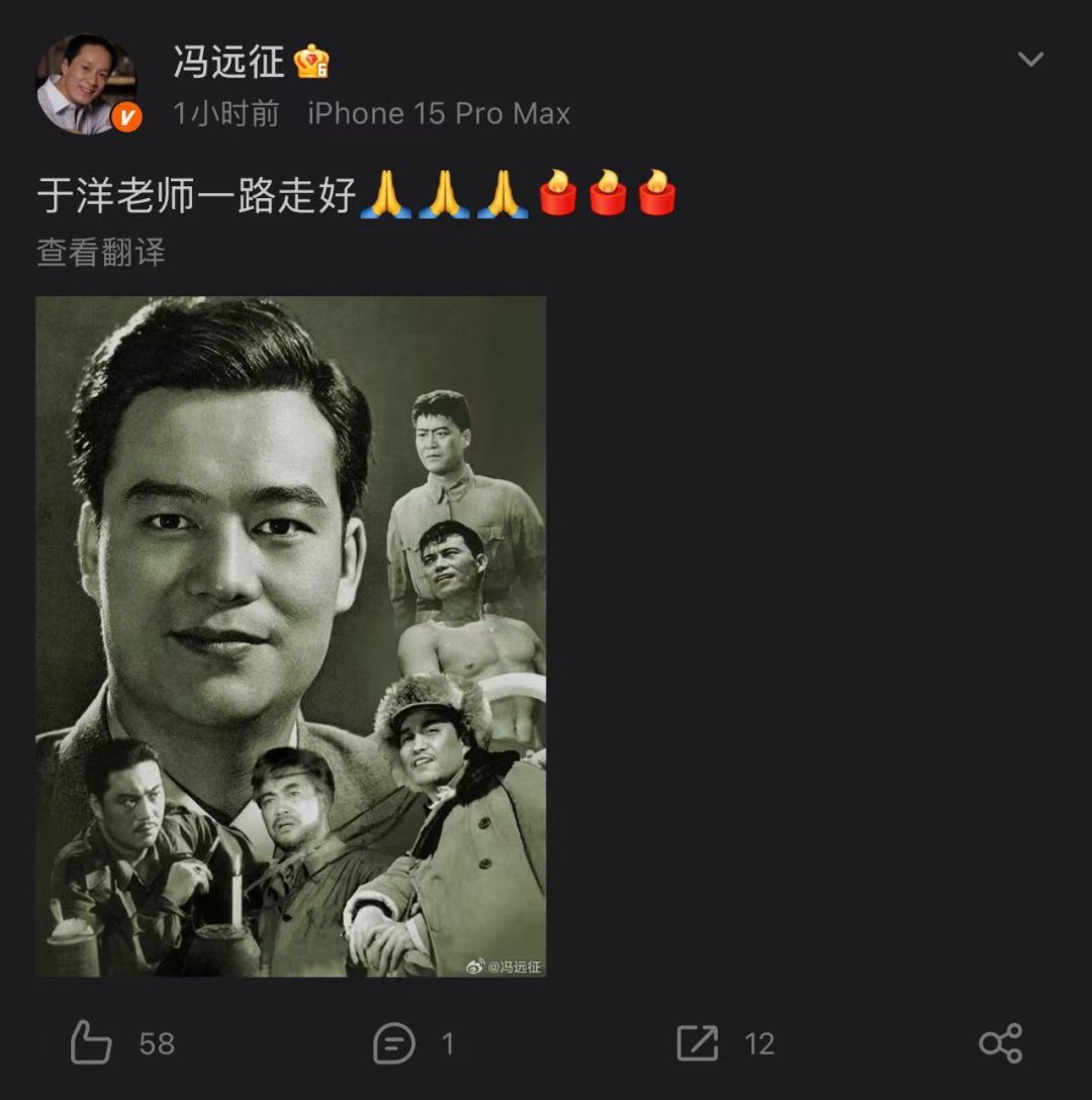 冯远征也发文悼念:于洋老师一路走好。