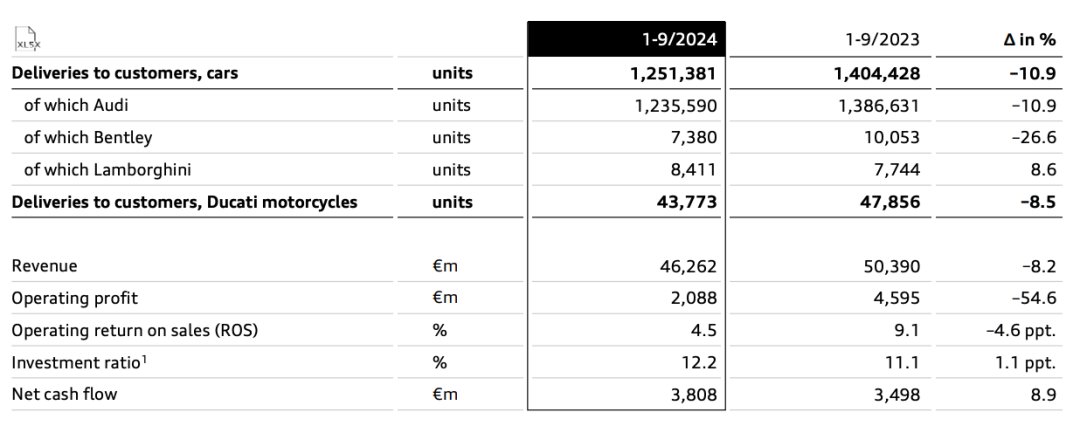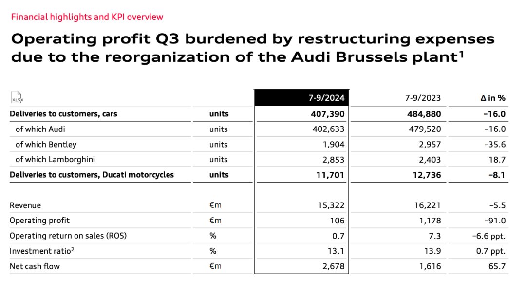 2024年11月6日,奥迪集团发布第三季度业绩报告。数据显示,第三季度奥迪营收为153.22亿欧元,同比下滑5.5%;营业利润仅为1.06亿欧元,暴跌91%。