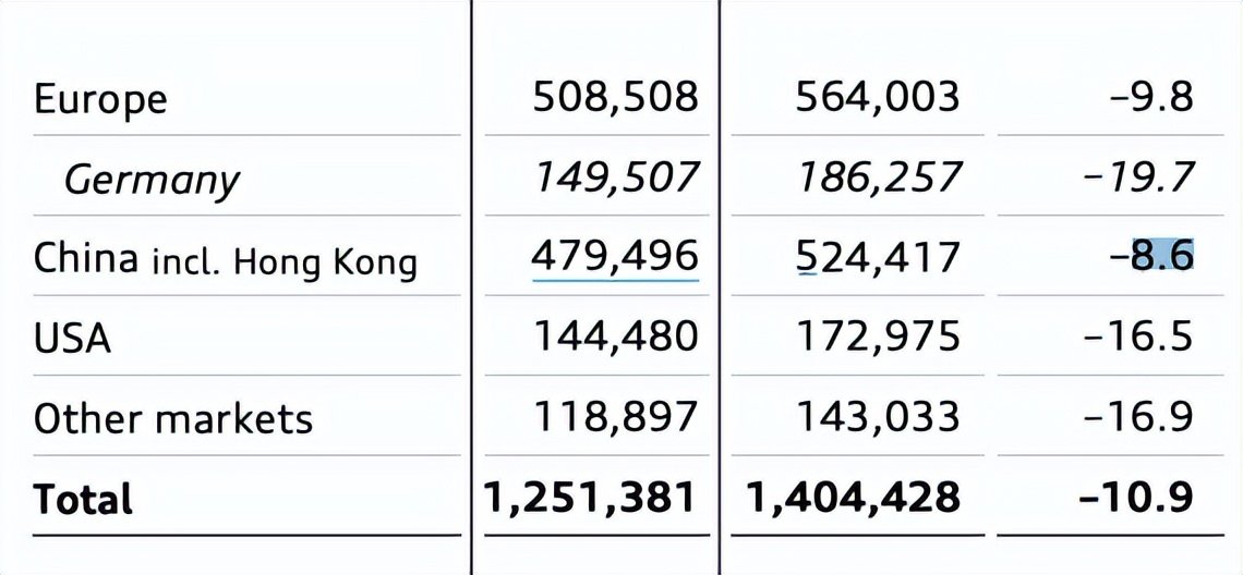 包括中国市场在内,奥迪的所有主要市场销量均出现下滑。奥迪在中国市场2024年前三季度的销量约为47.95万辆,下降了8.6%;在德国,奥迪交付了超过14.95万辆汽车,同比下降了19.7%;北美销量为14.45万辆,下降了16.5%;欧洲的交付量约为50.85万辆,下降9.8%;在其他市场,销量为11.89万辆,下降16.9%。