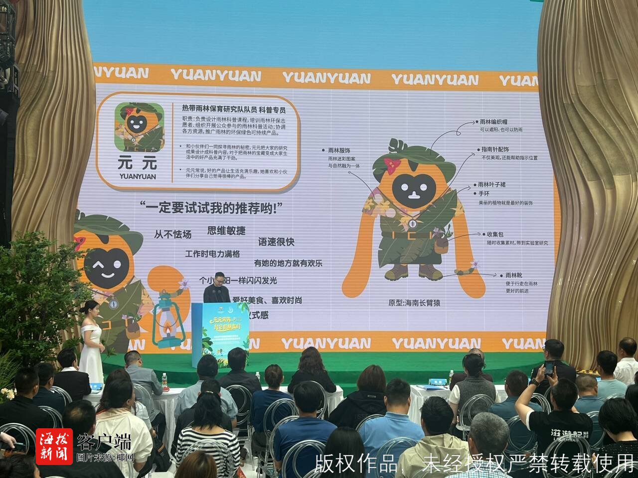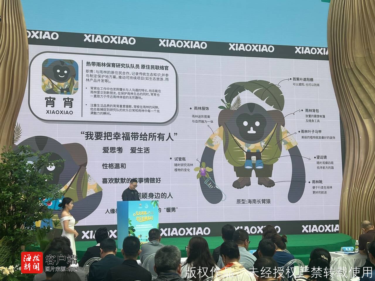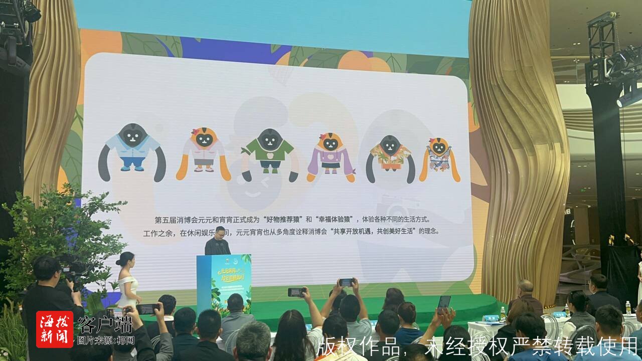 活动现场,消博会吉祥物“元元宵宵”和它的朋友们共同组成的热带雨林保育研究小队“闪现”舞台。除了以海南长臂猿为原型的元元、宵宵之外,来自海南本土的珍稀雨林动物,海南云豹、海南兔、海南鼯鼠、海南孔雀雉四名热带雨林保育研究小队成员首次亮相,体现海南在守护雨林,共建绿色海南方面的责任担当与累累硕果。