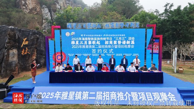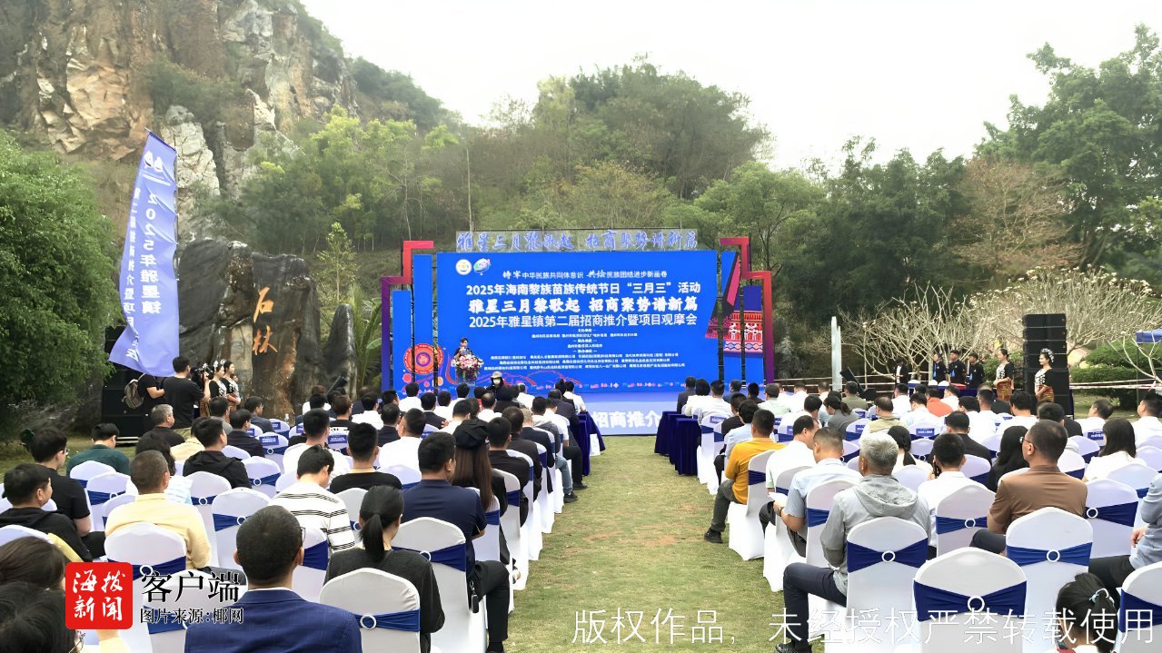商报全媒体讯(椰网/海拔新闻记者 黄桂风 摄影报道)3月29日,以“雅星三月黎歌起,招商聚势谱新篇”为主题的2025年雅星镇第二届招商推介暨项目观摩会在儋州市雅星镇八一石花水洞举行。本次活动旨在弘扬黎族苗族传统文化,以节为媒,以会招商,展示雅星镇独特魅力,吸引优质企业投资兴业,推动乡村振兴。