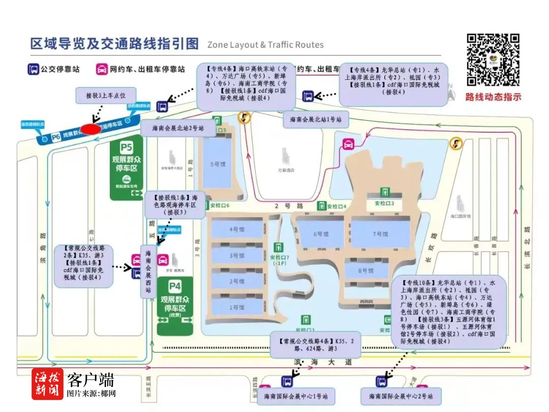 消博会期间,展会周边设置海南会展北站1号站、海南会展北站2号站、海南会展西站、海南国际会展中心1号站、海南国际会展中心2号站等5个公交站点。