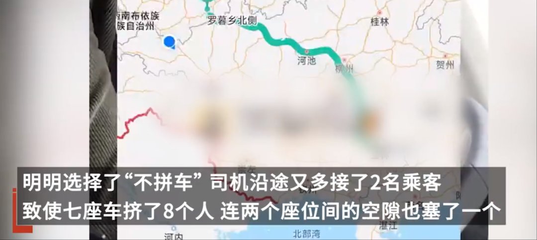 近日,来自广西的莫先生在线上平台投诉称,打哈啰顺风车回家,一家五口为了舒适特意选了“不拼车”,花了1400多元车费。然而司机沿途又多接了2个乘客,7座车挤了8个人,连两个座位间的空隙也塞了一个人。