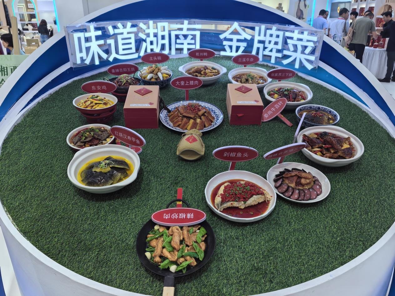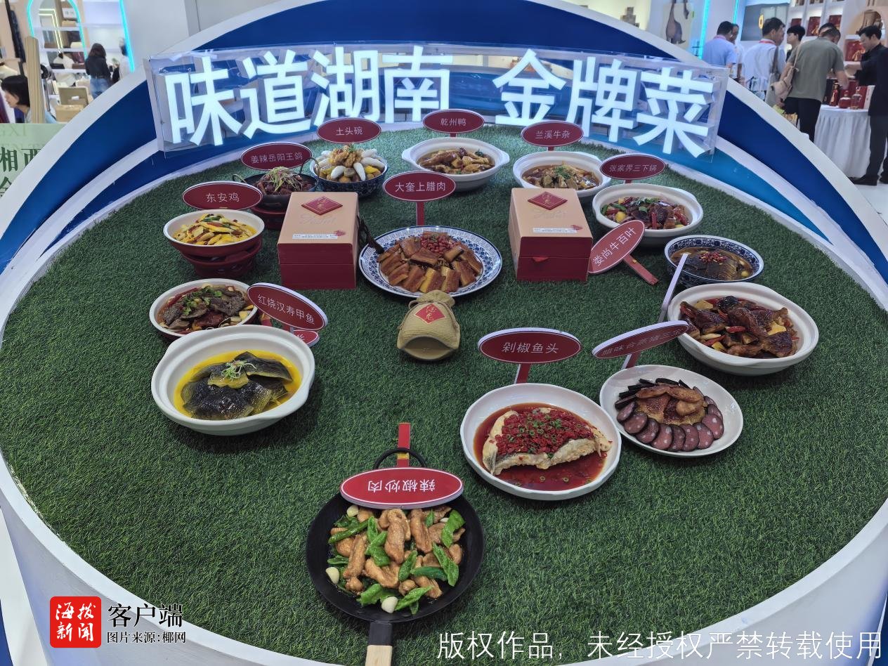 在7号馆湖南馆的一角,参展方搭建了一个展台,展台上摆满了湖南的金牌菜,有剁椒鱼头、辣椒炒肉、红烧汉寿甲鱼、大奎上腊肉、腊味合蒸转包、张家界三下锅、姜辣岳阳王鸽等10多道湖南名菜。海口市民魏先生来到消博会就直奔湖南馆,他告诉记者,10年前他到海南定居,因工作原因不常回家乡,但对家乡的思念从未停止。“看到这些菜品,我更加想念老家了,希望借消博会平台让湖南的味道飘到更远的地方。”魏先生说。