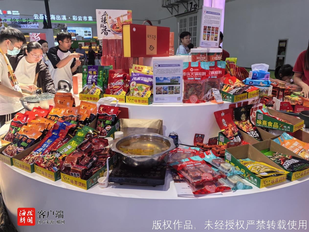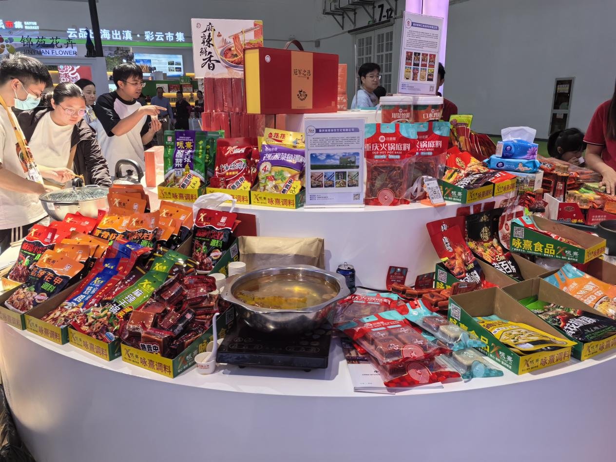 在7号馆的重庆展区,几口火锅旁聚满了不欢不辣的重庆火锅爱好者。大家一边试吃着刚出锅的毛肚、腐竹,一边挑选着品类丰富的火锅底料。重庆火锅既激活了观众的味蕾,也点燃了大家的消费热情。