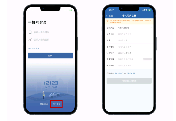 下载“交管12123”APP后,点击“用户注册”。按照系统提示填写好个人信息,填写完成后点击“同意协议并继续”。