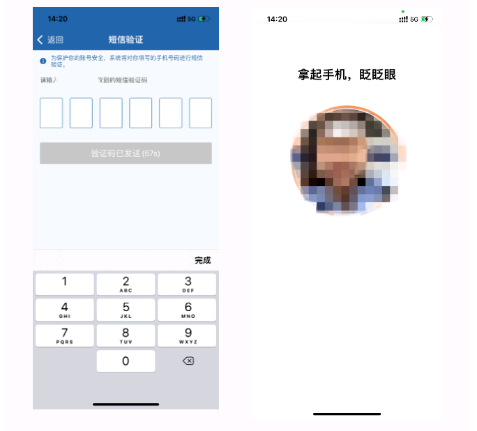 手机将会接收短信验证码,输入验证码进入人脸识别,按照文字提示进行识别。