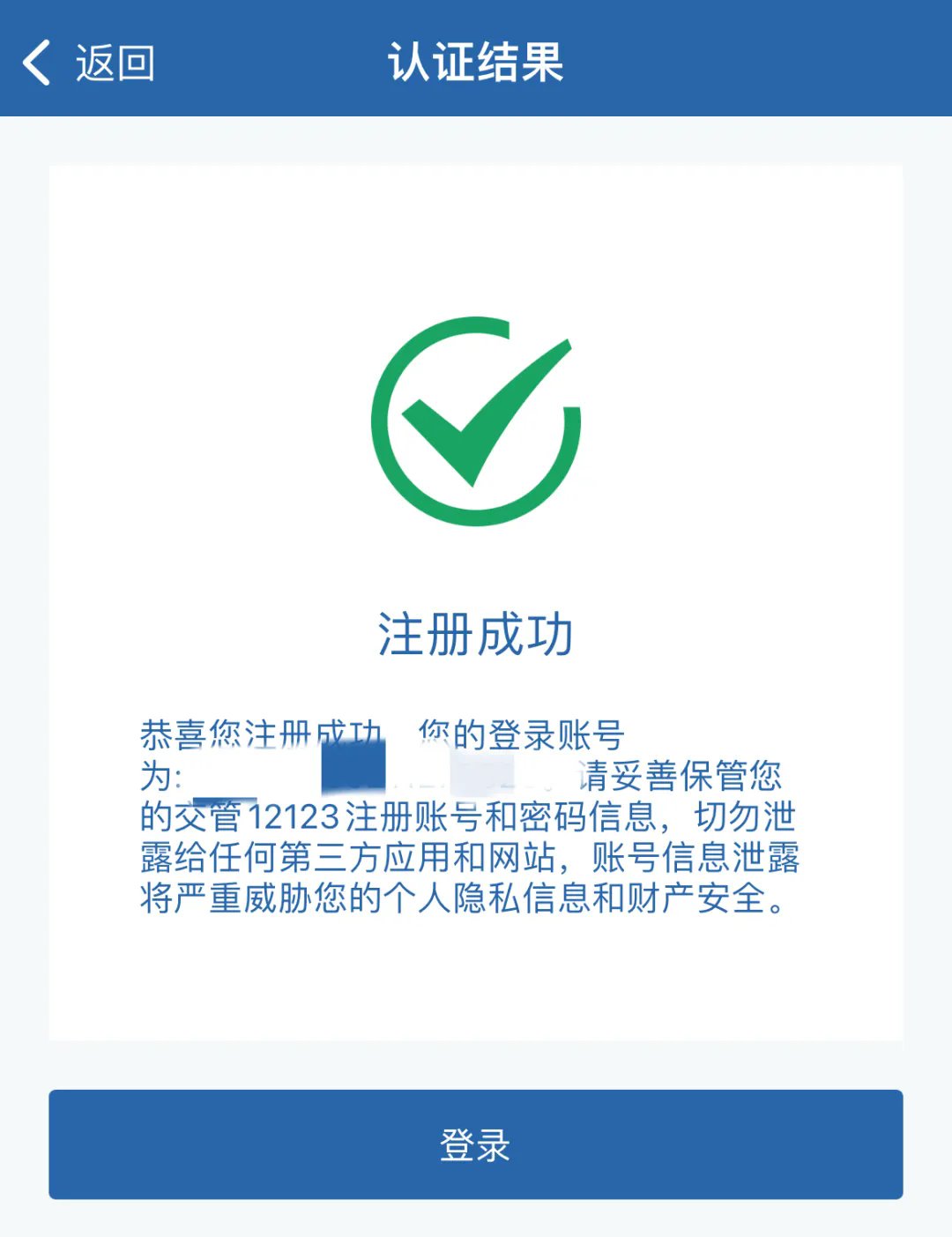识别成功后就注册成功了,点击登录即可进入“交管12123”APP页面。
