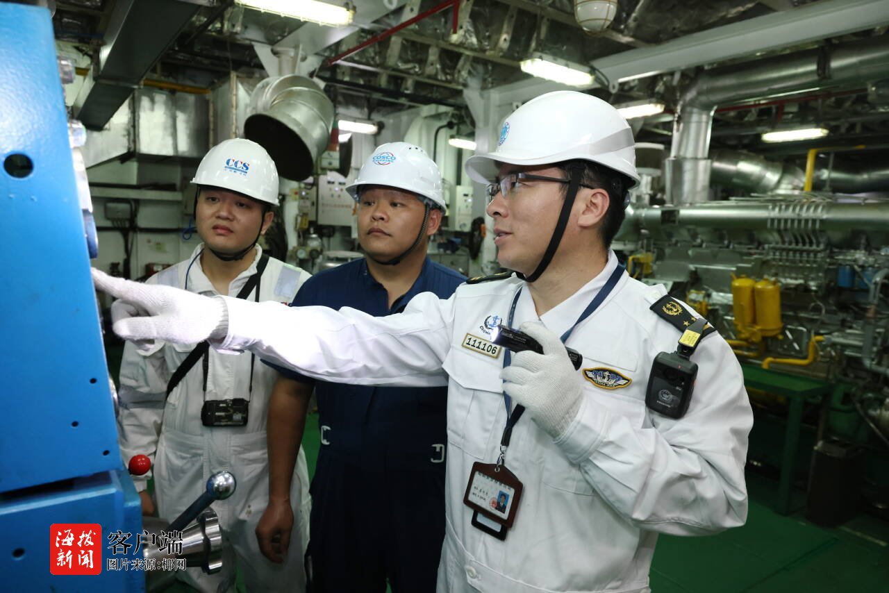 商报全媒体讯(椰网/海拔新闻记者 徐明锋 通讯员 聂守亮 方旭霞 摄影报道)4月24日下午,海口海事局联合中国船级社海南分社在海口秀英港对“腾胜宝昌”轮完成安全检查,标志着琼粤桂海事部门完成“五一”节前琼州海峡客滚船专项安检行动。