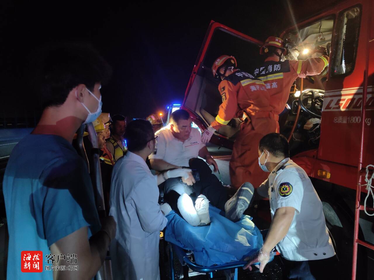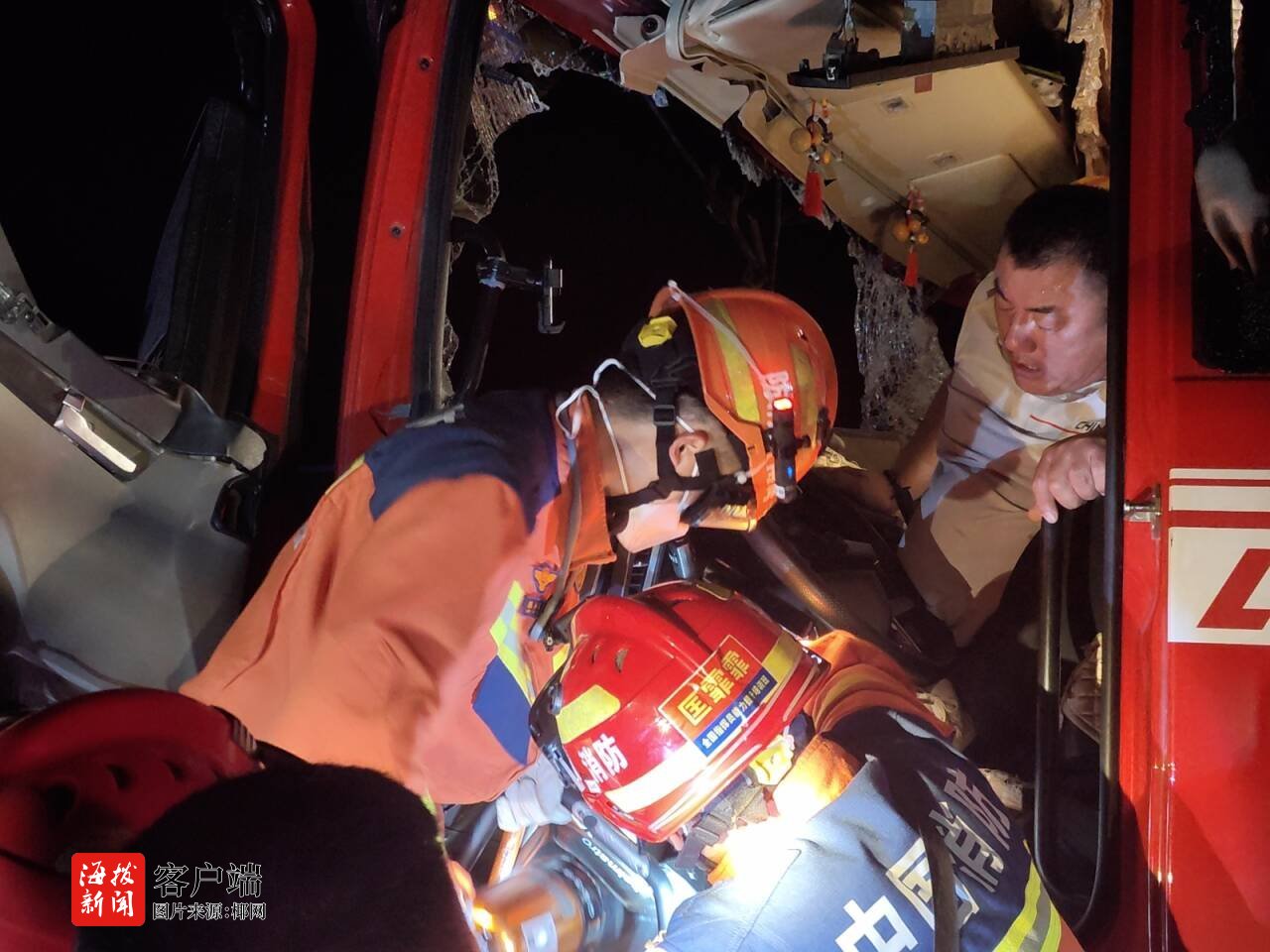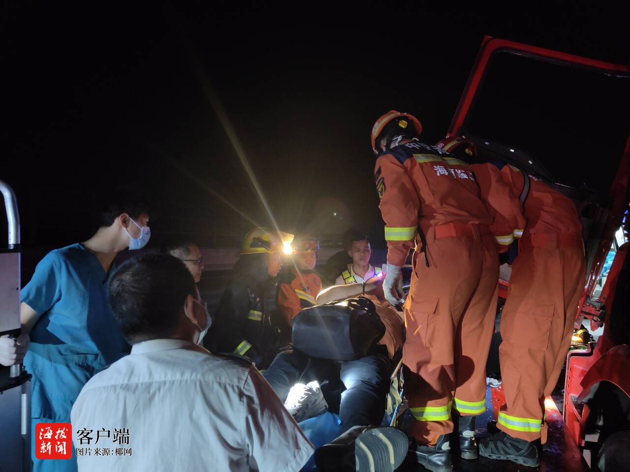 据了解,4月23日3时许,两辆大货车在海南环岛高速三亚往海口方向临高路段发生交通事故,导致车辆严重变形,驾驶员被困在驾驶室无法脱险,便拨打119求助。
