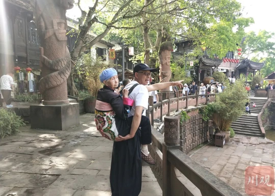 5月1日当天,一家人到黄龙溪旅游。考虑到一些路段无法推轮椅,柴万斌就带上了当初背儿子的背带。一路上,他和三姐两人换着背。考虑到平常主要是三姐照顾妈妈,加之三姐比自己年长,自己是当天背妈妈的主力。
