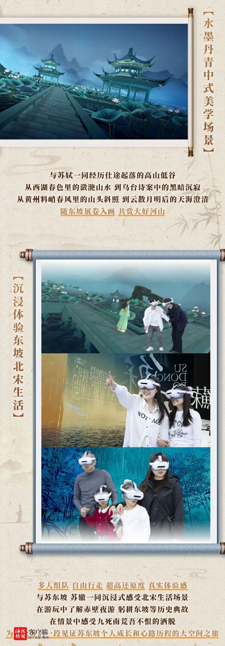 据了解,此次活动是以苏轼个人生涯为故事主线,融合经典诗词作品、国风写意壮美山河、北宋生活场景复原,其通过前沿VR技术复原八大苏轼人生场景,结合影视化电影,还原真实立体苏轼形象,25分钟穿越北宋,苏东坡“亲自”陪您吟诗作画、把酒言欢。