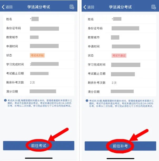 第五步,提交成功后,已完成学习的驾驶人用户可在学法减分页面点击【前往考试】进入阅读考试须知。阅读完毕后,点击【阅读并同意】进入实人认证环节,通过后进入答题界面。在所有题目答完之后将会进入实人认证,认证结束后由系统判定考试是否合格。如之前考试没通过且剩余考试次数还有的情况下,点击【前往补考】进入补考。
