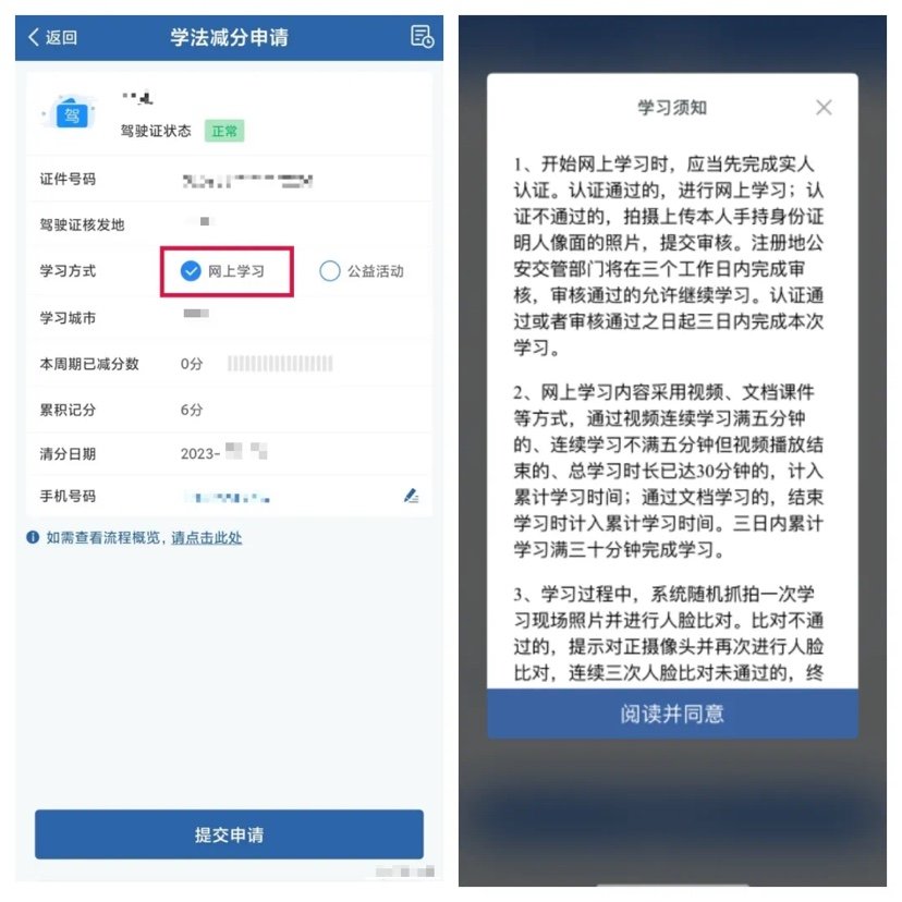 第三步,已完成学法减分业务申请并受理的驾驶人,在学法减分页面点击【前往学习】,阅读学习须知后点击【阅读并同意】进行实人认证。