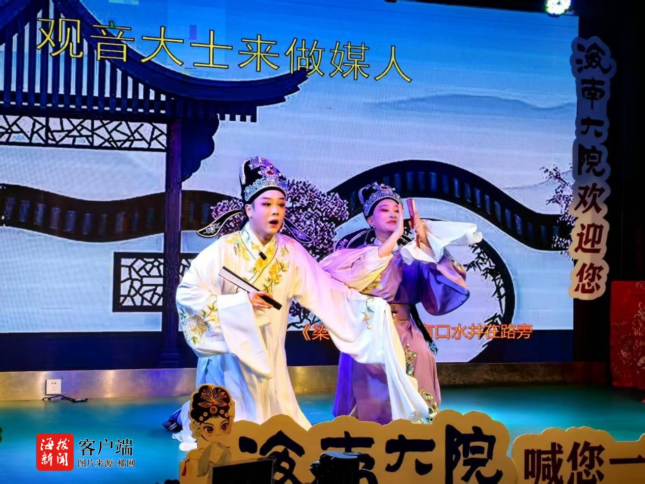 今年四月起,这座人文院落再添妙笔——百年琼韵正式入驻老街厅戏台。每周三午后三时,每周五、六(晚七时)华灯初上时,水袖轻扬处,《张文秀》的诙谐、《梁祝》的缠绵、《红叶题诗》的婉转便流淌开来。专业演员以珠圆玉润的唱腔、顾盼生辉的演绎,让古老剧种焕发新生。当满头银发的阿婆跟着《刁蛮公主》的唱段轻打节拍,当北方的客人对着字幕屏惊叹琼剧竟比想象中更动人,文化传承的深意便在这方舞台悄然绽放。
