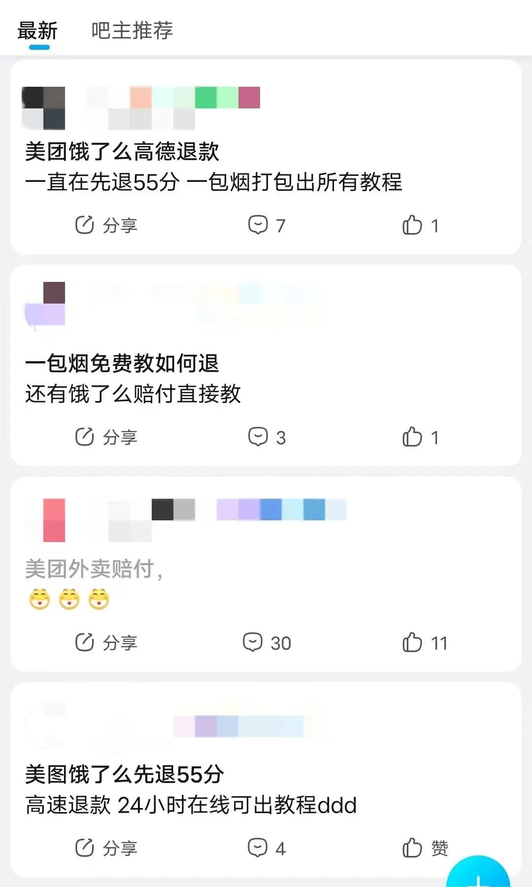 “外卖赔付”教程可吃“免费午餐”?在贴吧等网络平台进行搜索,有不少专门出售“外卖退款”的教程且数量众多。在百度贴吧中,有专门的“美团退款吧”,累计发帖量已超过6000篇,其中排名靠前的帖子均为出售相关“攻略”——“美团外卖退款”“一包烟免费教如何退、还有饿了么赔付直接教……”在一些帖子下,有网友询问“怎么联系”,楼主要求私信,有的还留下了自己的QQ号。