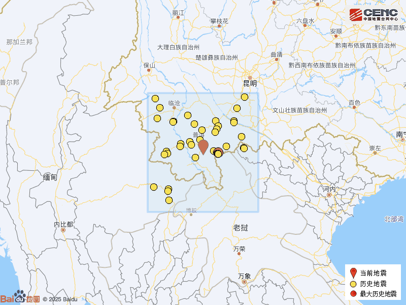 历史地震:根据中国地震台网速报目录,震中周边200公里内近5年来发生3级以上地震共48次,最大地震是2021年12月24日在老挝发生的6.0级地震(距离本次震中58公里),历史地震分布如图。