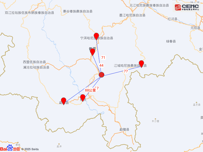 周边县城:震中距思茅区44公里、距景洪市57公里、距宁洱哈尼族彝族自治县71公里、距江城哈尼族彝族自治县77公里、距勐海县88公里,距普洱市49公里,距昆明市333公里。