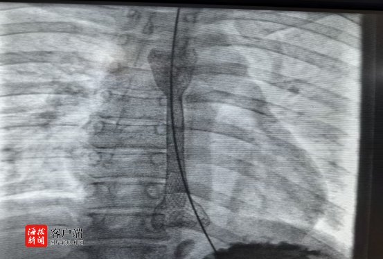 4月16日,由消化内科蔡笃雄主任医师、高飞主治医师,介入血管外科孙刚副主任医师、廖勇主治医师,介入导管室林子义技师、谢春花副主任护师等组成的精锐手术团队严阵以待。内镜下,食管狭窄处仅露出一条细小缝隙,手术难度极高。但在X射线透视的精准引导下,手术团队凭借丰富经验和高超技艺,经过多次尝试,终于让导丝成功穿过狭窄段进入胃腔!随后,5mm和8mm扩张球囊逐级撑开狭窄食管,最后顺利置入食道金属支架。造影剂顺利通过食管狭窄段进入胃腔,此次高难度手术取得良好效果。