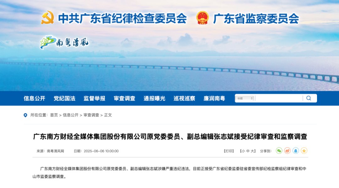 据南粤清风官网消息,广东南方财经全媒体集团股份有限公司原党委委员、副总编辑张志斌涉嫌严重违纪违法,目前正接受广东省纪委监委驻省委宣传部纪检监察组纪律审查和中山市监委监察调查。