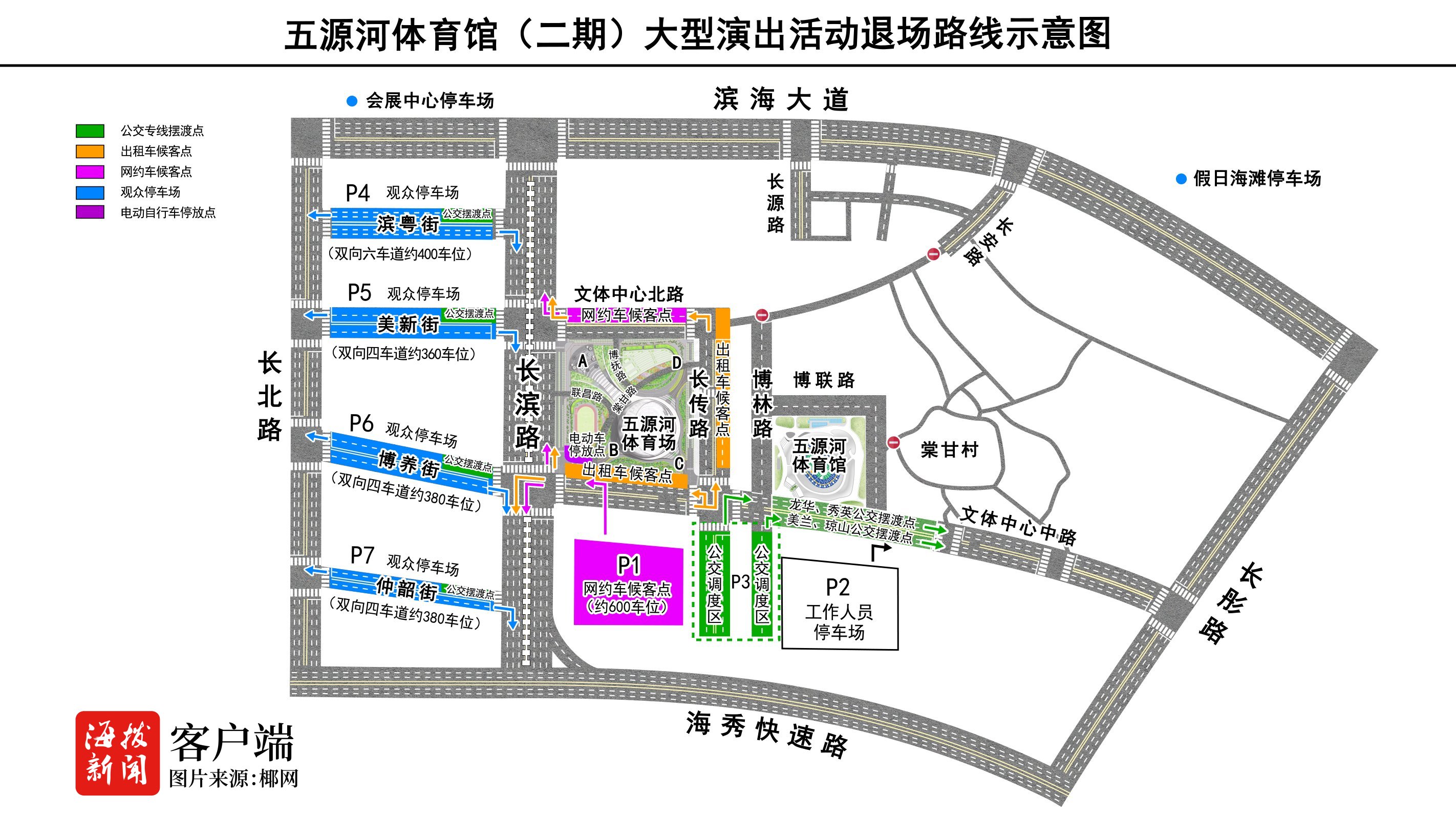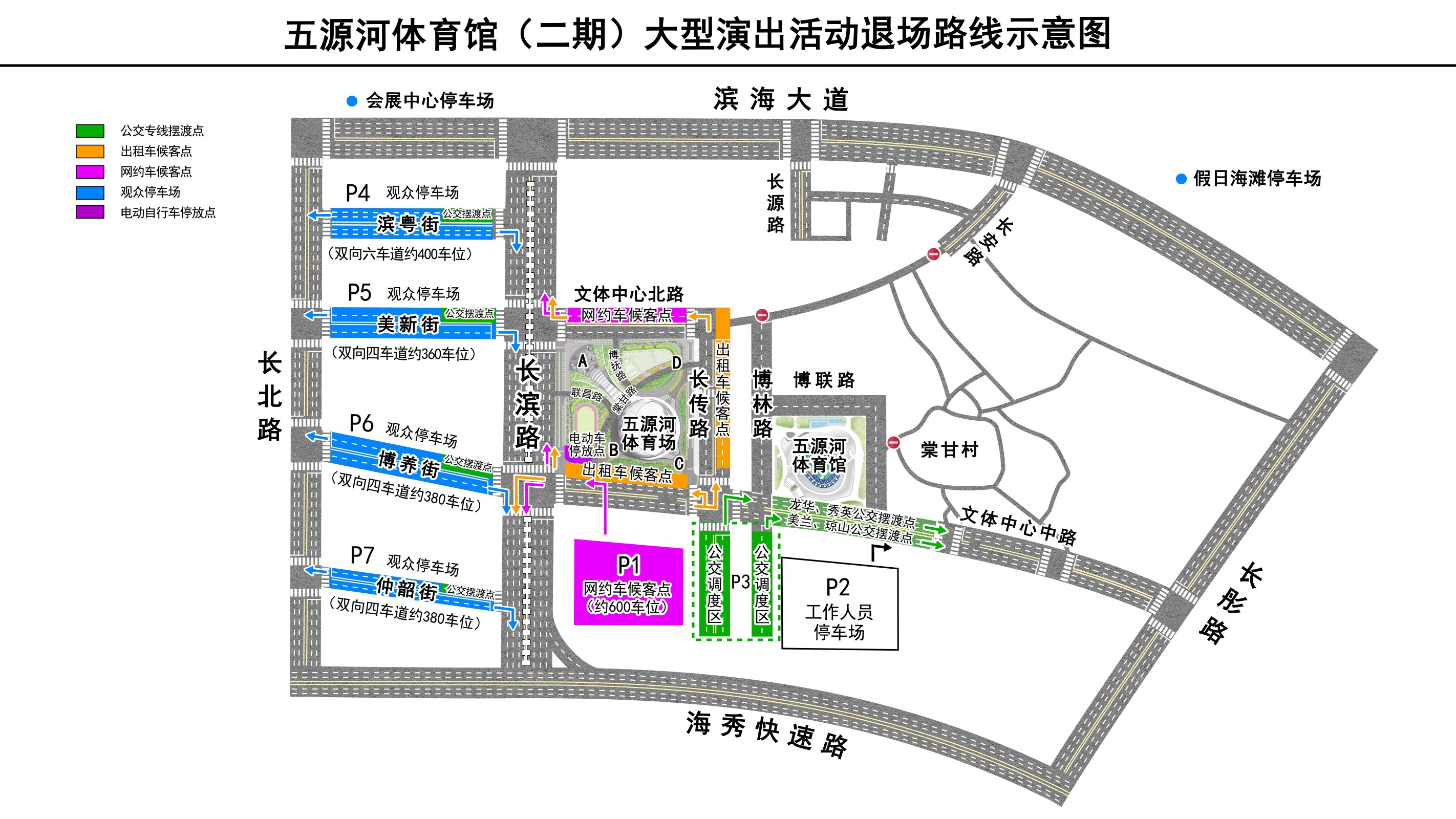 演唱会退场时,将调整文体中心中路(长传路至长彤路)实行西往东单向通行、长传路实行南往北单向通行、文体中心北路实行东往西单向通行的交通管控措施。