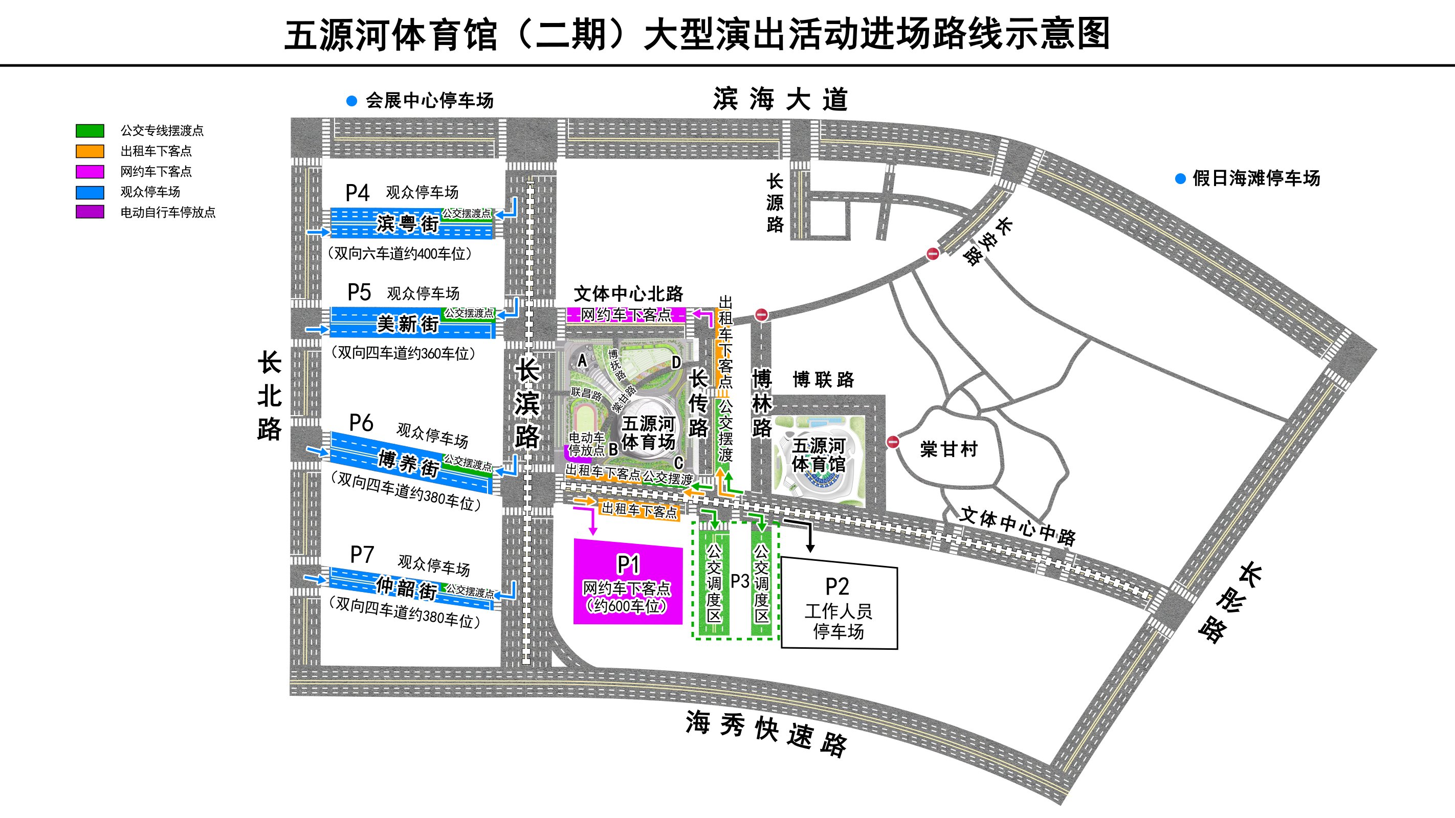 演唱会进场时,文体中心中路、长传路、文体中心北路路段按规划交通流线有序通行,并根据车流量实施适时交通管控措施。