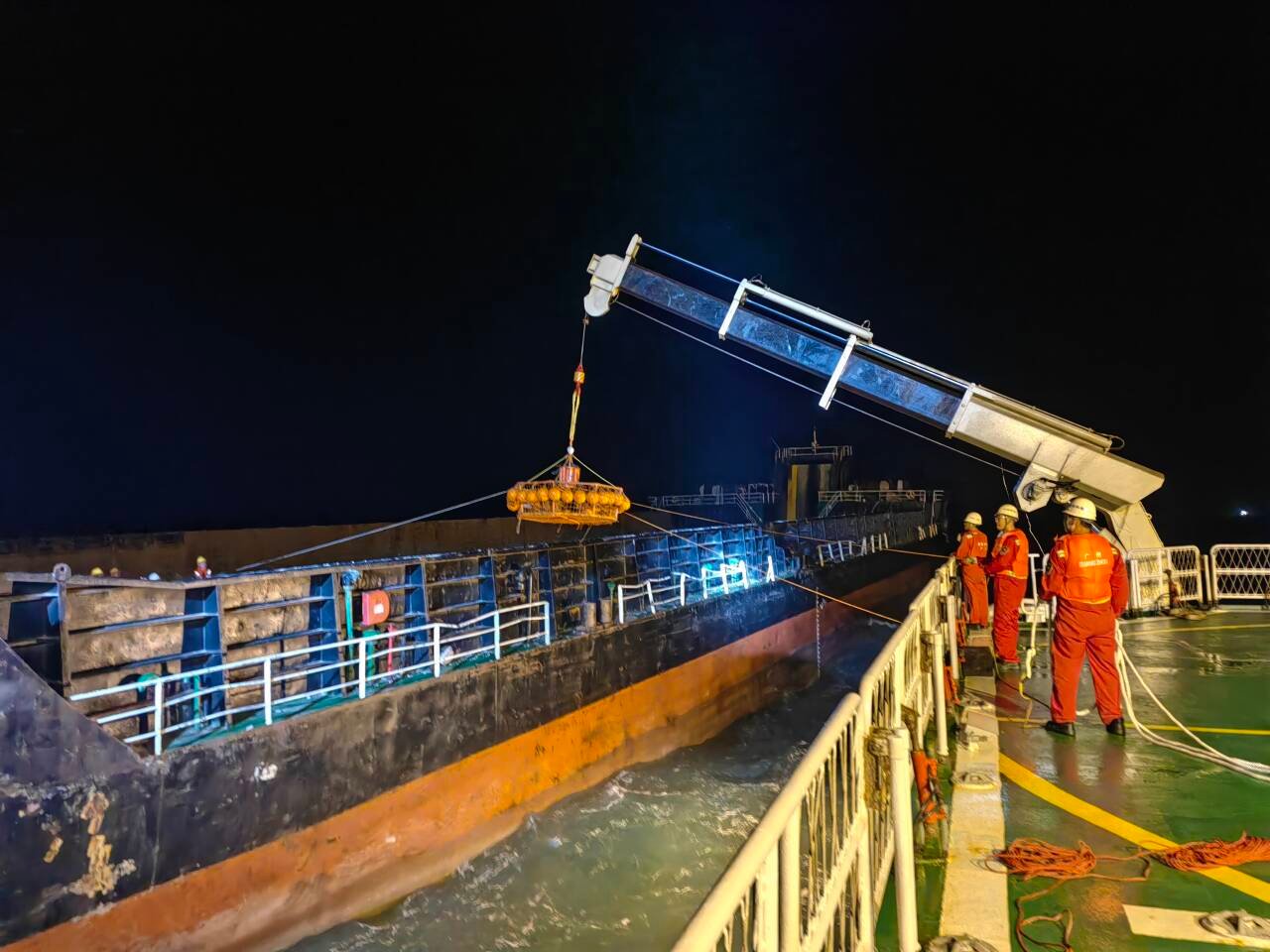 12日18时30分,“南海救102”轮紧急起锚赶赴现场。救助人员从三亚海上搜救中心获悉,该轮已抛双锚固定,现场风力7~8级,浪高3米。12日23时50分,救助船抵达现场后,救助人员冒着恶劣海况,经过43分钟紧张作业,于13日00时33分成功通过救生吊篮将12名船员全部安全接下,并在遇险船舶上放置救生AIS定位装置。13日0时40分,“南海救102”轮载获救人员返航三亚湾锚地,预计13日午间抵达锚地。