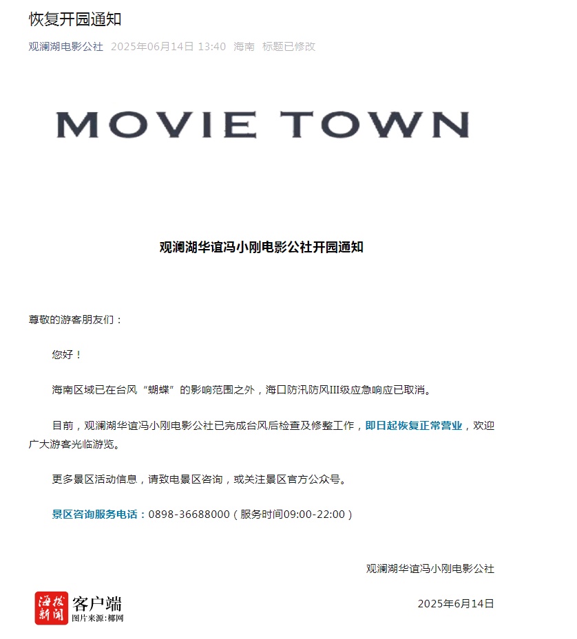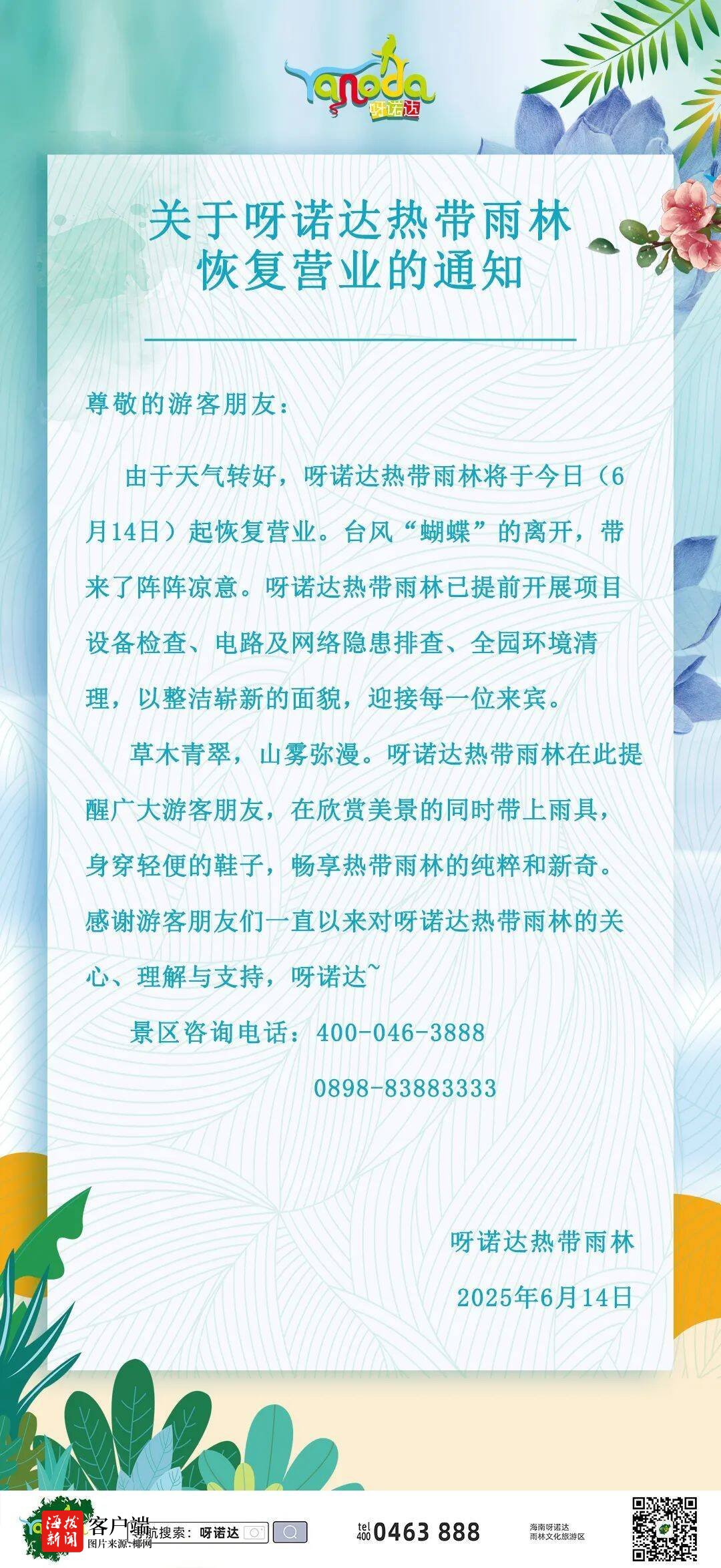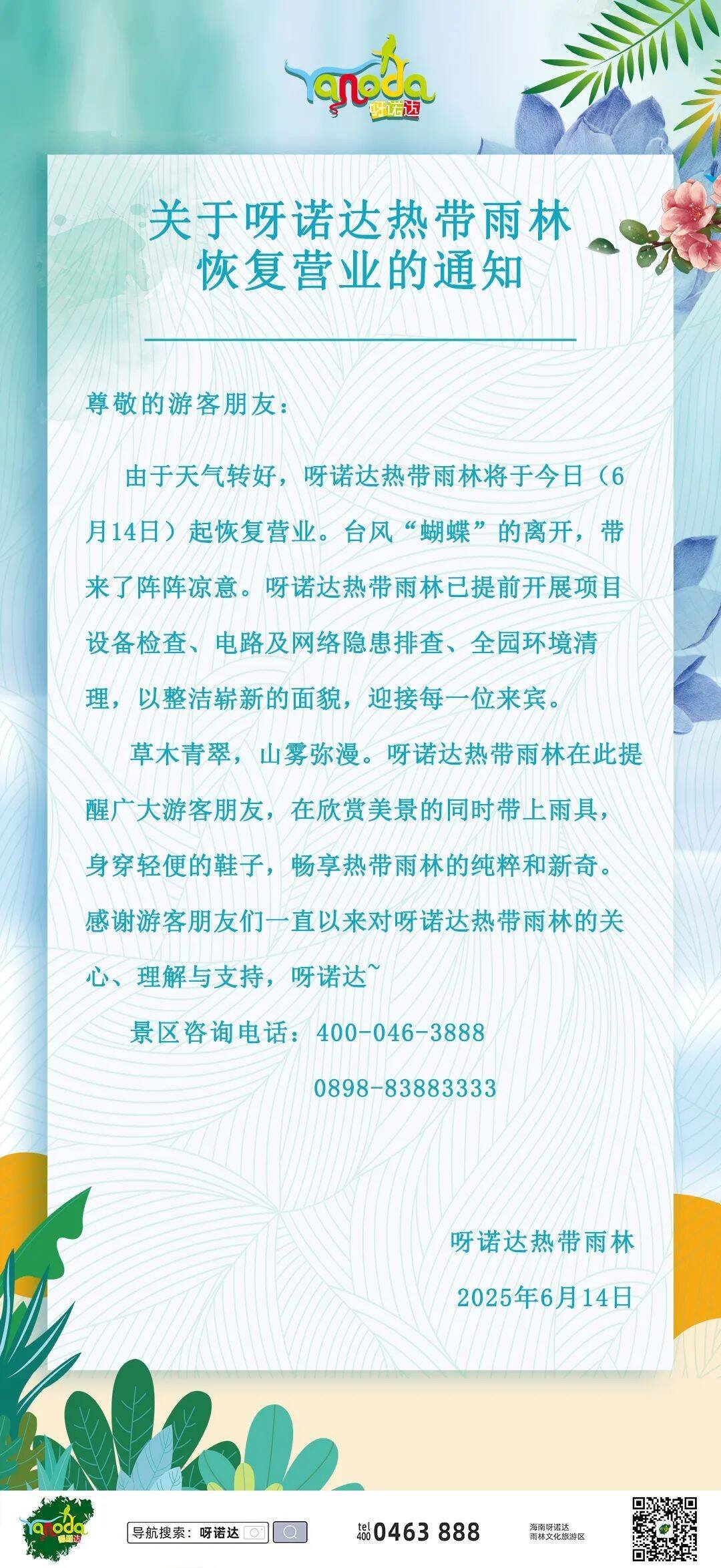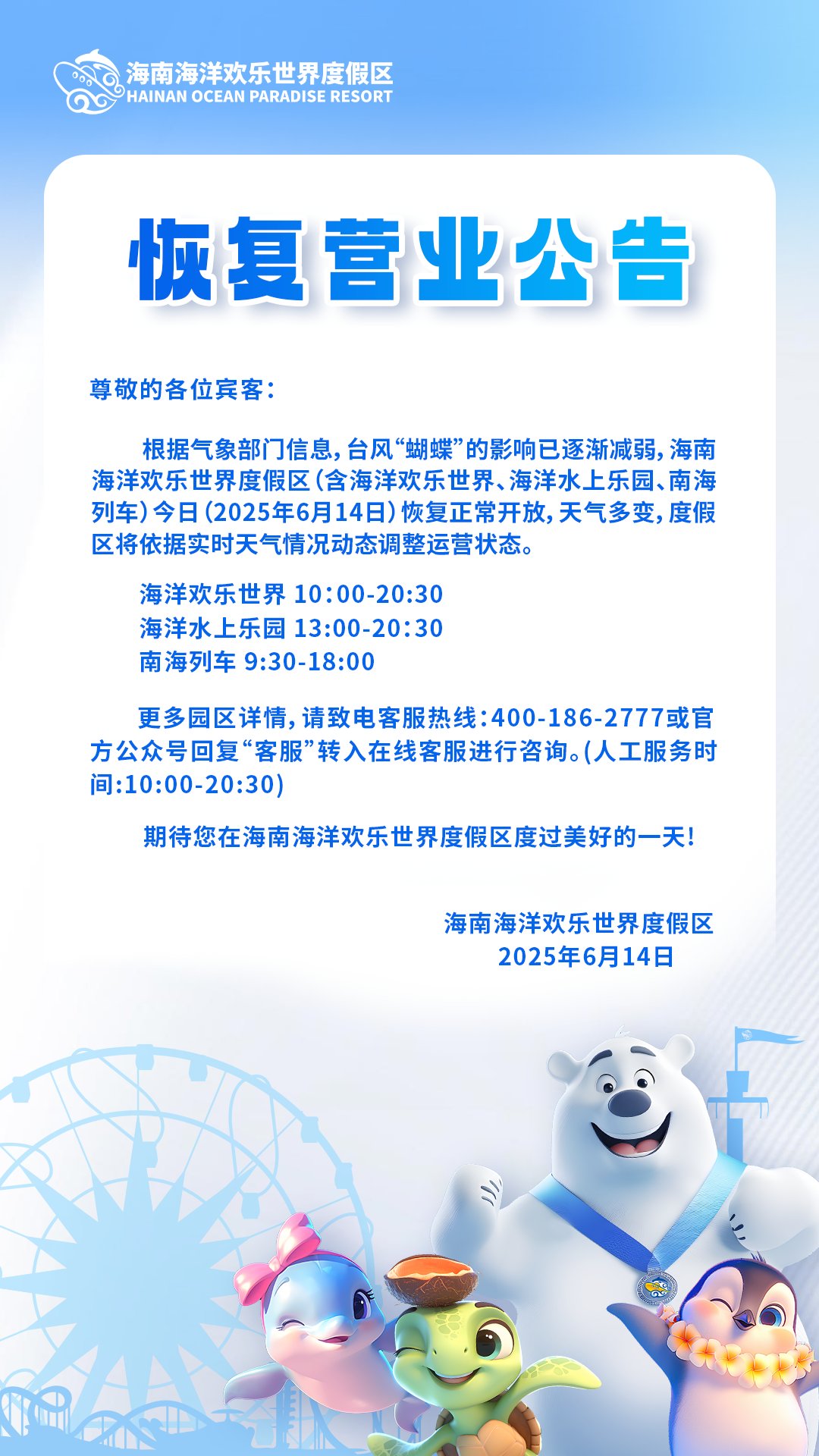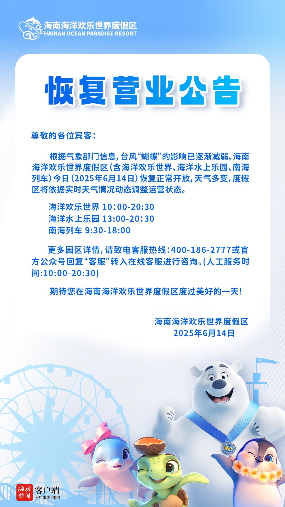 商报全媒体讯(椰网/海拔新闻记者 张艺)6月14日,国际旅游岛商报记者获悉,即日起,海南省多个旅游景区景点陆续有序恢复正常营业,其中,包括了海南海洋欢乐世界度假区、海南呀诺达雨林文化旅游区、观澜湖华谊冯小刚电影公社等知名景区景点。