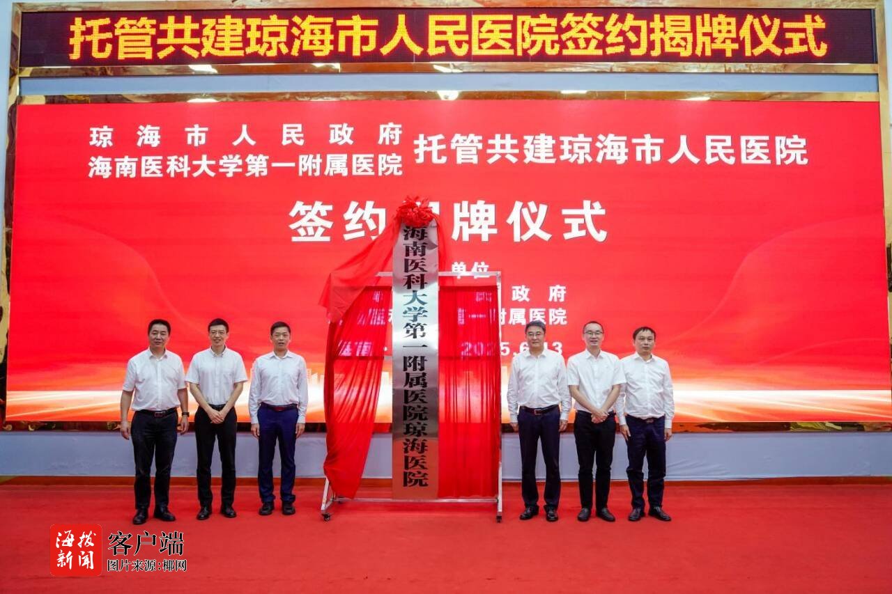 商报全媒体讯(椰网/海拔新闻记者 孙鑫)6月13日,琼海市人民政府与海南医科大学第一附属医院(以下简称“海医一附院”)托管共建琼海市人民医院签约揭牌仪式举行,“海南医科大学第一附属医院琼海医院”正式挂牌。这意味着琼海市民无需奔波省城,即可在“家门口”享受省级医院优质医疗资源服务,标志着琼海医疗民生服务迈入高质量发展新阶段。