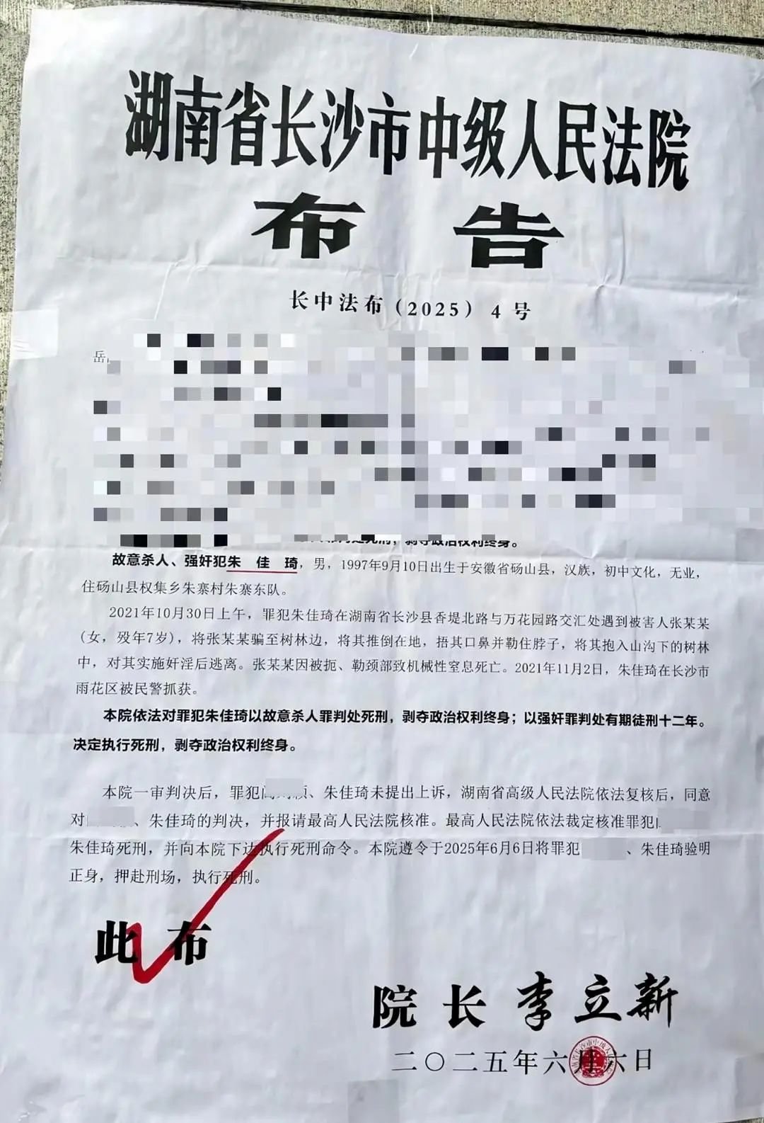 一审判决后,罪犯朱佳琦未提出上诉,湖南省高级人民法院依法复核后,同意对朱佳琦的判决,并报请最高人民法院核准。“最高人民法院依法裁定核准罪犯朱佳琦死刑,并向本院下达执行死刑命令。本院遵令于2025年6月6日将罪犯朱佳琦验明正身,押赴刑场,执行死刑。”