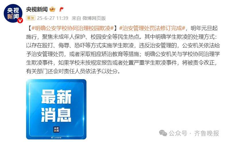 新修订的治安管理处罚法还聚焦未成年人保护、校园安全等民生热点。其中明确学生欺凌的处理方式:以存在殴打、侮辱、恐吓等方式实施学生欺凌,违反治安管理的,公安机关依法给予治安管理处罚,或者采取相应矫治教育等措施;明确公安机关与学校协同治理学生欺凌事件,如果学校未按规定报告或者处置严重学生欺凌事件,将被责令改正,有关部门还会对责任人员依法予以处分。