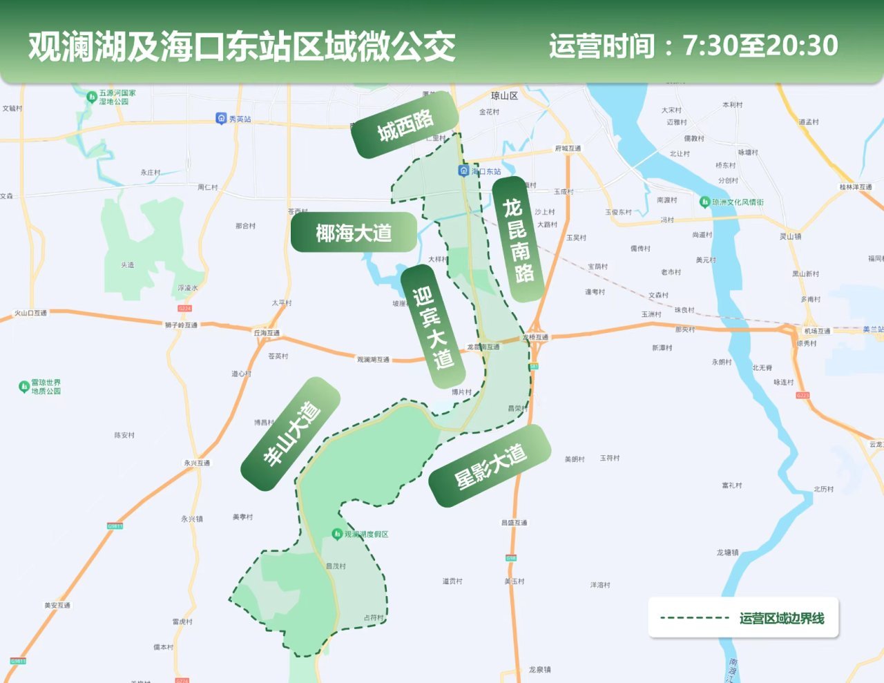 运营边界:主要覆盖城西路南、苍峰路、迎宾大道、羊山大道、S81省道、学富东路/南路、富观路、观澜湖景区边界及星影大道围合区域。