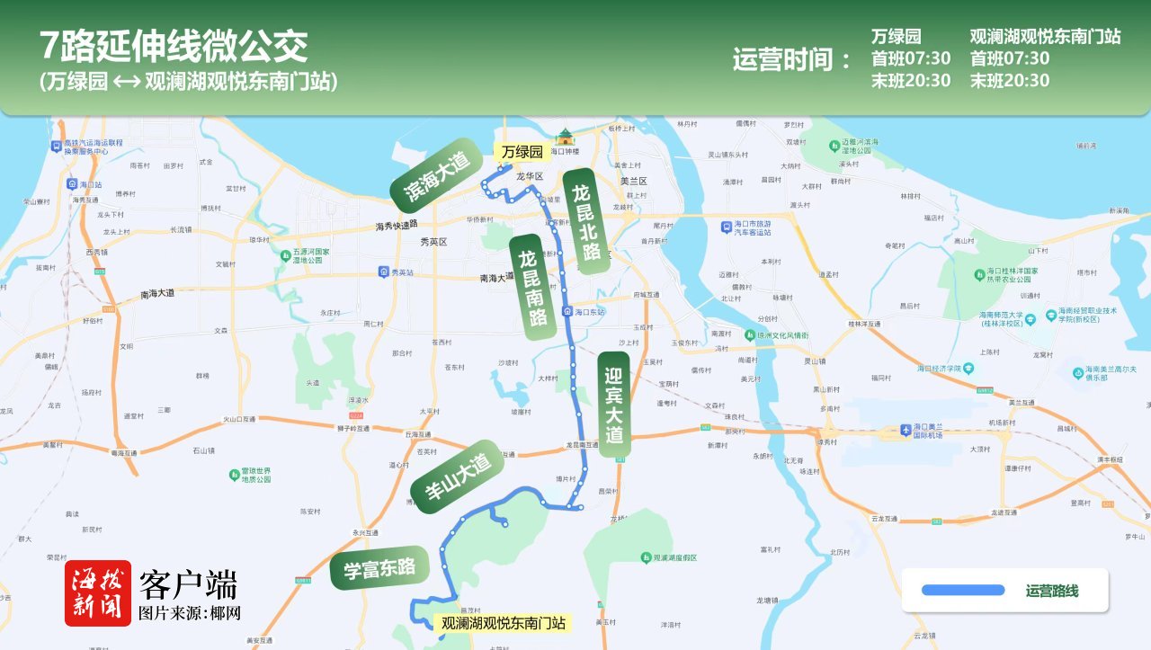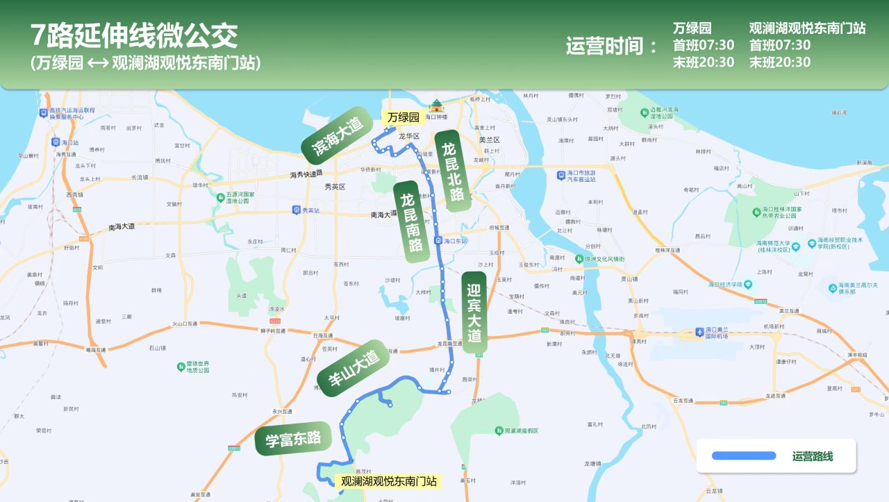 商报全媒体讯(椰网/海拔新闻记者 王辉)为持续完善海口市“骨干线+接驳线为主体、多样线为补充”的公交线网体系,有效填补公交服务盲区,解决市民出行“最后一公里”,海口公交自6月28日起将开通7路延伸线微公交、观澜湖及高铁东站区域微公交两条全新微公交线路。