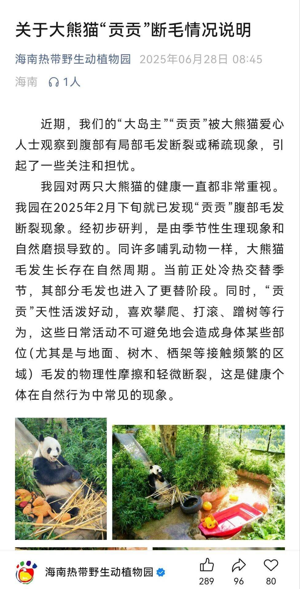 商报全媒体讯(椰网/海拔新闻记者 张艺)6月28日,海南热带野生动植物园发布大熊猫“贡贡”断毛情况说明,其内容称,近期“大岛主”“贡贡”被大熊猫爱心人士观察到腹部有局部毛发断裂或稀疏现象,引起了一些关注和担忧。该园表示,他们对两只大熊猫的健康一直都非常重视,在2025年2月下旬就已发现“贡贡”腹部毛发断裂现象。