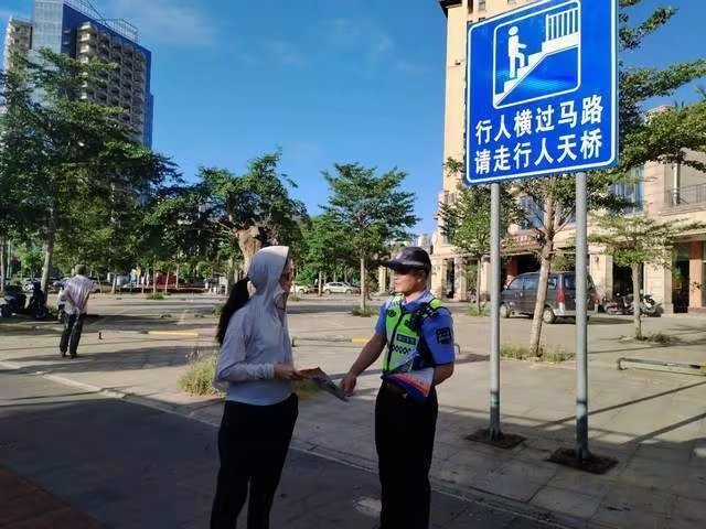 在双拥公园路段,海口公安交警琼山大队针对市民为图方便,无视交通信号灯与斑马线,随意横穿马路的行为,及时上前制止并引导至斑马线。通过现场讲解“鬼探头”事故案例,强调“斑马线是生命线”,勿让“捷径”变“险径”,引导市民养成安全通行习惯。