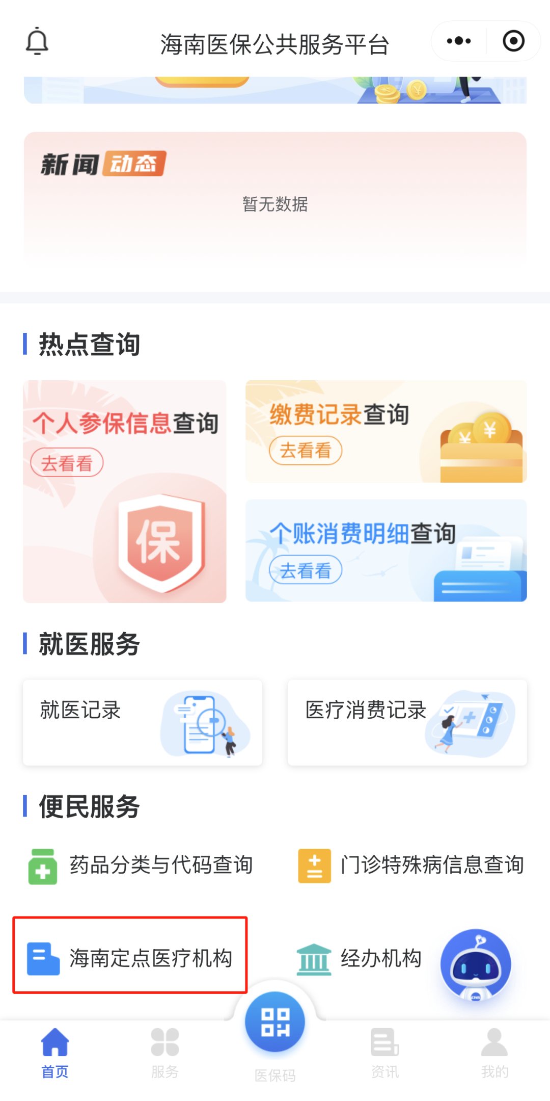 朋友们可以在“海南医保”微信小程序中,首页划至下方的“海南定点医疗机构”进行查询。