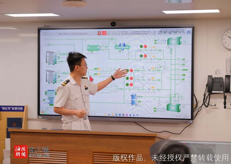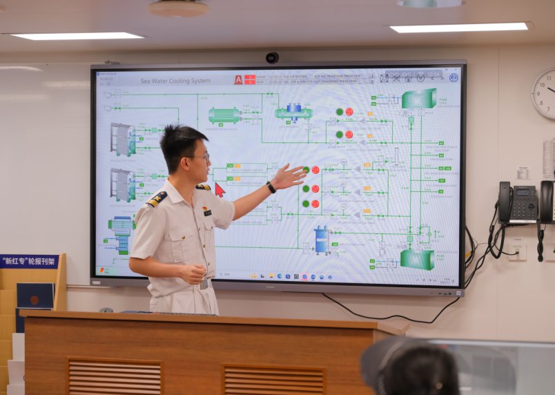 在船上的“驭海智启”智能船舶实训中心,大家争相体验模拟机舱,感受操纵船舶的乐趣。该实训中心由中远海运集团与大连海事大学联合打造,以“新红专”轮智能船舶为核心载体,融合全电力驱动、i-Ship智能系统等前沿技术,构建集教学实训、科研创新、技术验证于一体的综合性平台,可同时容纳30名学员开展驾机电综合实训、智能航行、远程控制等实践项目,是校企协同推进航运智能化人才培养、助力我国航运产业升级的标志性成果。“屏幕上展示的是大连海事大学基于数字孪生技术自主研发的一款模拟器。”实训中心大连海事大学学生介绍,通过这套模拟器,学生们可以在沉浸式虚拟环境中开展驾驶台操作、轮机设备管理、电气系统维护训练,并与实体船舶系统交互验证,提升对船舶“驾、机、电”融合系统的综合认知与实操水平。