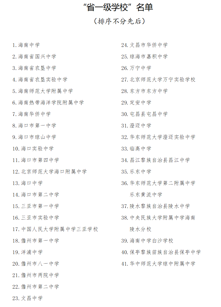 设置考试科目和综合素质评价等级要求。“省一级学校”(不含自主招生计划)和经省教育厅批准面向全省招生的普通高中学校实验班,只录取各考试科目等级均达到C等(含)以上、综合素质评价总等级达到B等(含)以上的应届初中毕业生。引进优质教育资源合作举办的上海世外附属海口学校、中国人民大学附属中学海口实验学校,以及海口市琼山中学谭文学校、海口一中金沙湾学校,录取条件参照“省一级学校”的标准执行。
