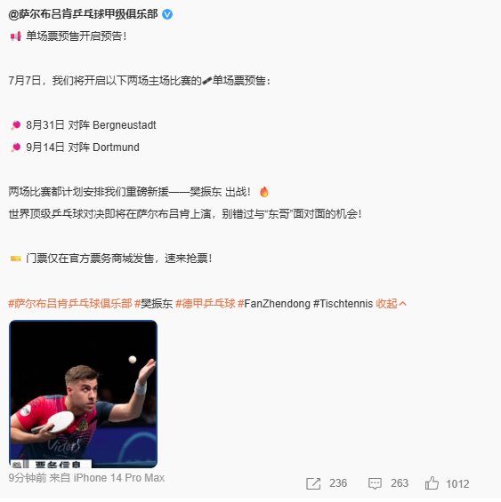 7月4日,据德国萨尔布吕肯乒乓球甲级俱乐部消息,8月31日和9月14日的两场主场比赛都计划安排重磅新援樊振东出战。
