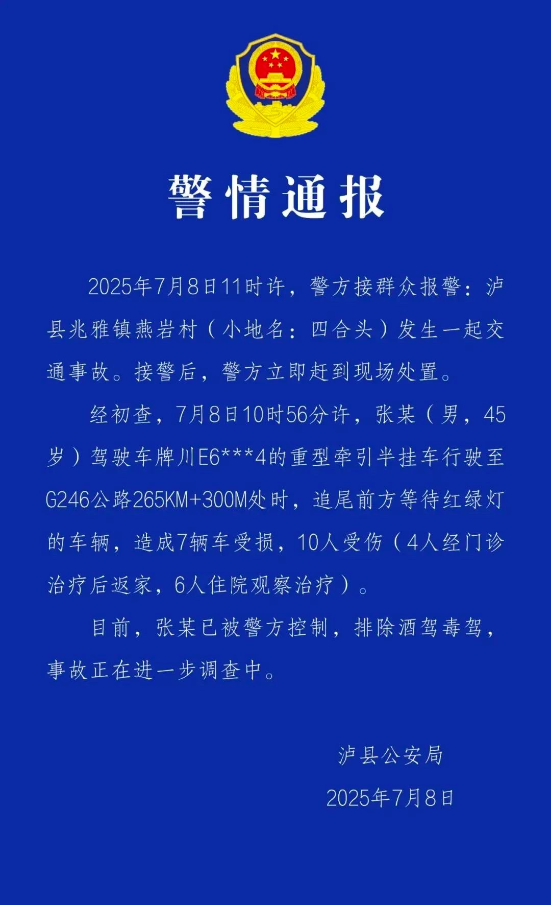 7月8日,四川泸州泸县公安局发布警情通报——