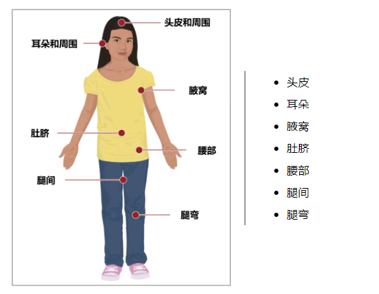 蜱虫喜欢温暖、潮湿的身体部位: