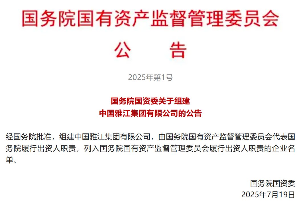 (原标题:国务院国资委关于组建中国雅江集团有限公司的公告)