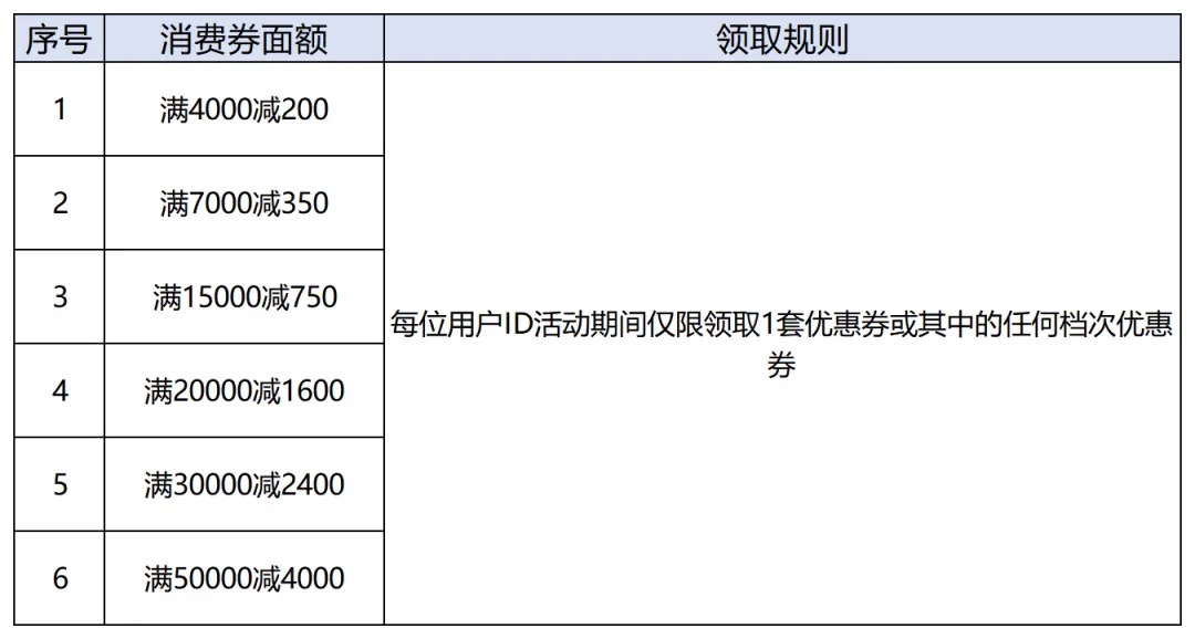 (1)每位用户ID活动期间仅限领取1套优惠券或其中的任何档次优惠券。
