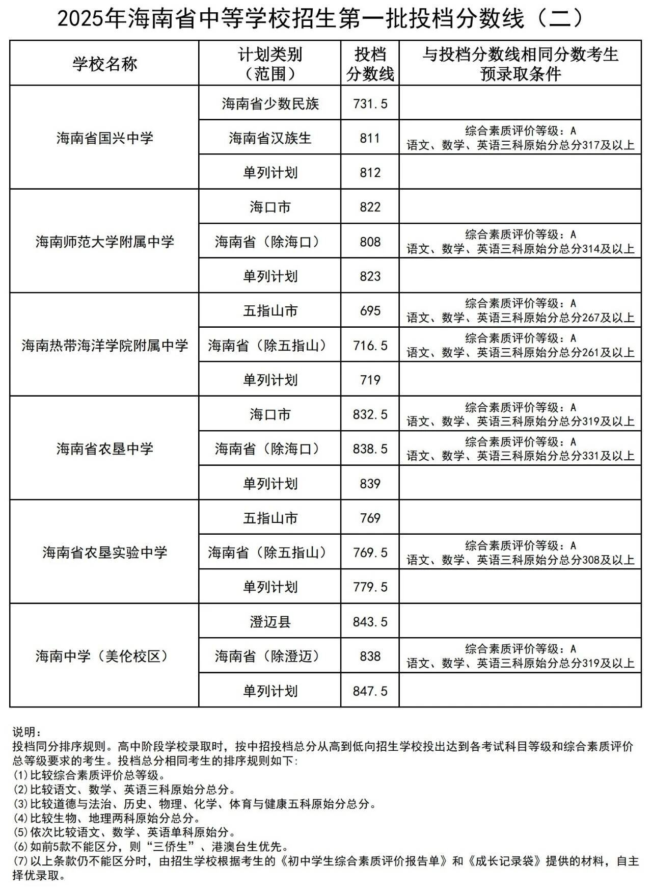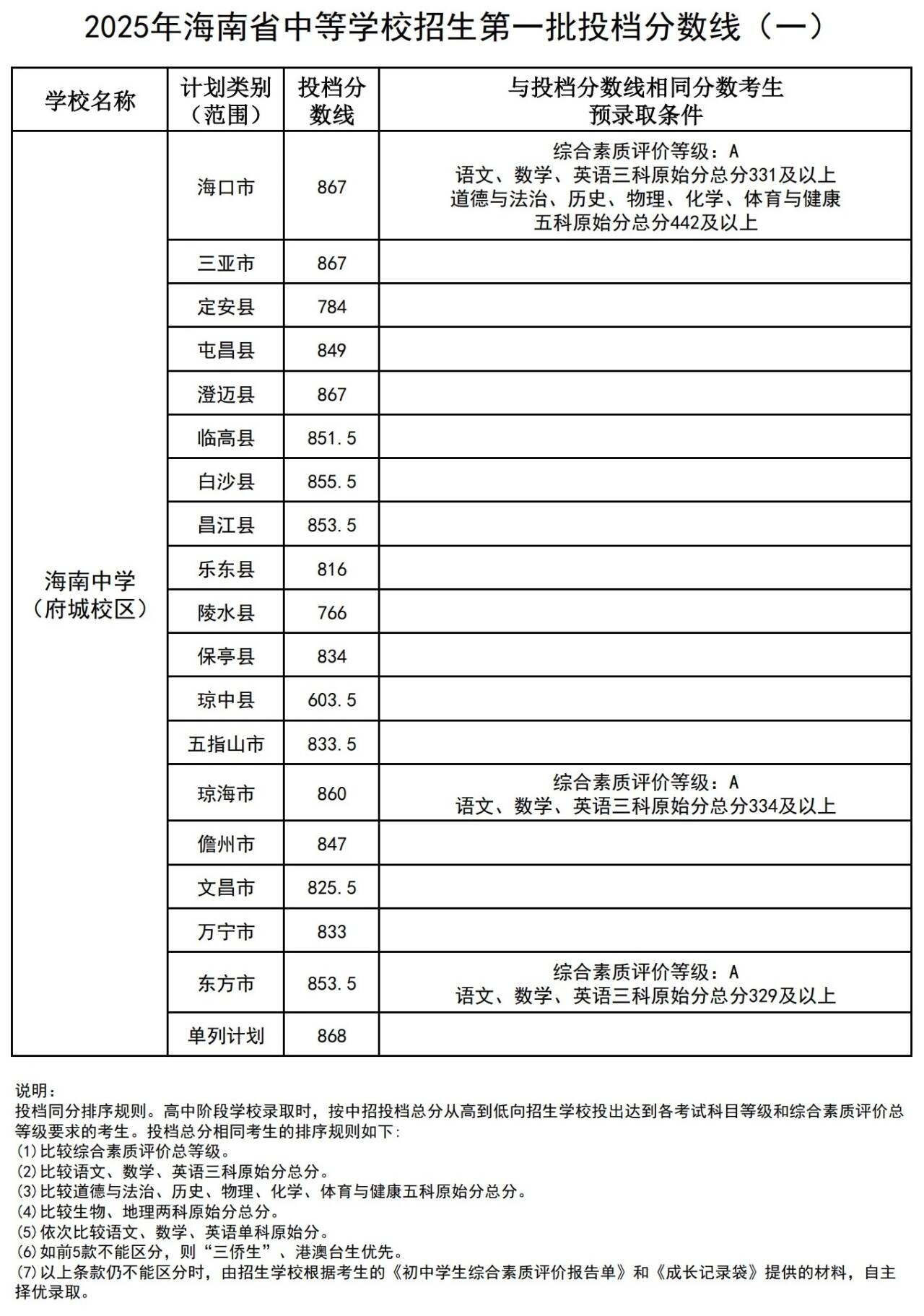 商报全媒体讯(椰网/海拔新闻记者 许文玉)7月25日,海南省考试局发布2025年海南省中等学校招生第一批投档分数线(一)(二)(三)(四),其中,海南中学(府城校区) 海口市投档分数线867分,与投档分数线相同分数考生。