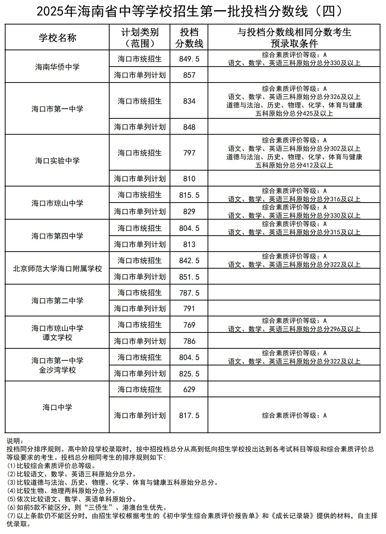 海南华侨中学海口市统招生投档分数线849.5 分,与投档分数线相同分数考生预录取条件要求综合素质评价等级:A,语文、数学、英语三科原始分总分330及以上。海口市单列计划投档分数线 857分。