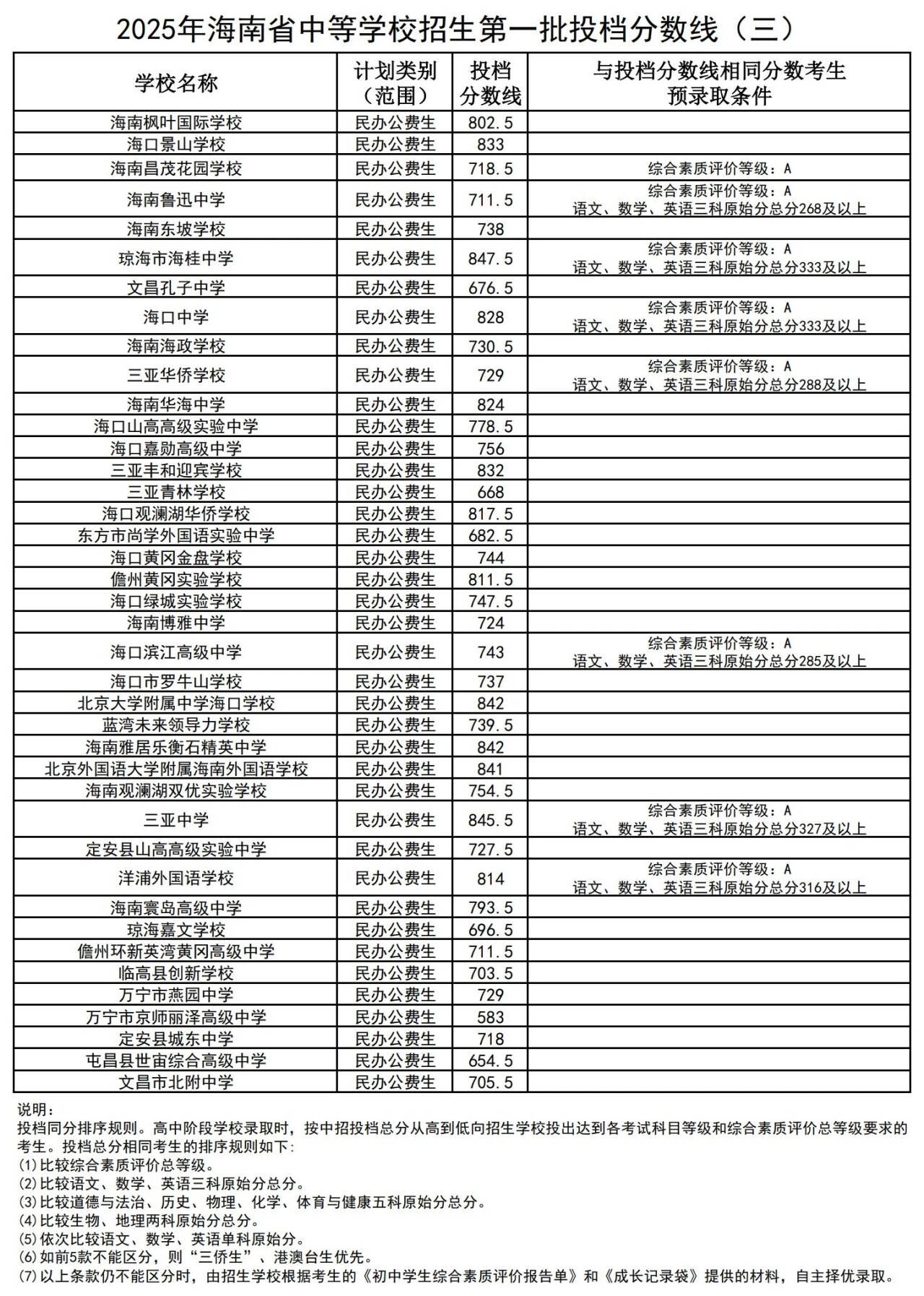 海南枫叶国际学校 民办公费生投档分数线802.5分,海口景山学校 民办公费生投档分数线833分,海南昌茂花园学校民办公费生投档分数线718.5分, 与投档分数线相同分数考生预录取条件要求综合素质评价等级:A。