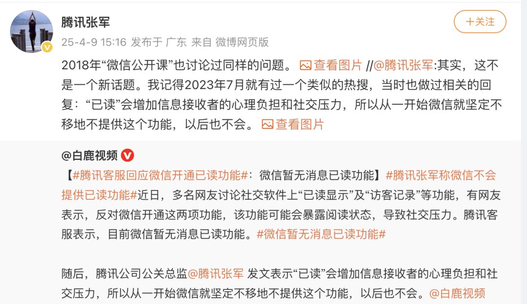 同时,腾讯公司公关总监@腾讯张军 也发文强调,这个话题此前就进行过回复。他表示:“已读”会增加信息接收者的心理负担和社交压力,所以从一开始微信就坚定不移地不提供这个功能,以后也不会。