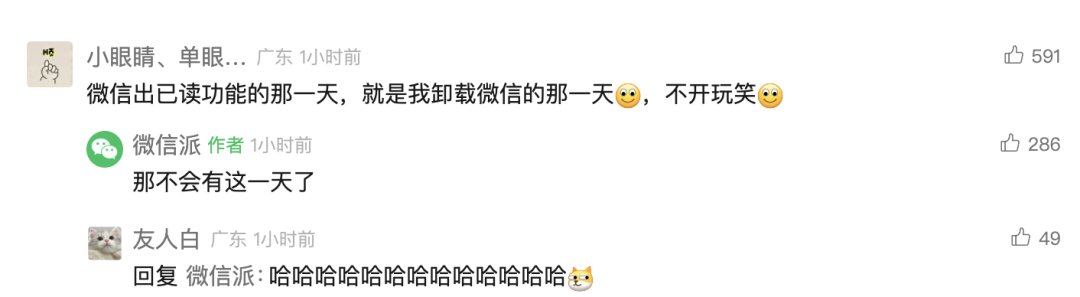 评论区也有网友说,“微信出已读功能的那一天,就是我卸载微信的那一天,不开玩笑”。微信派回复:那不会有这一天了。