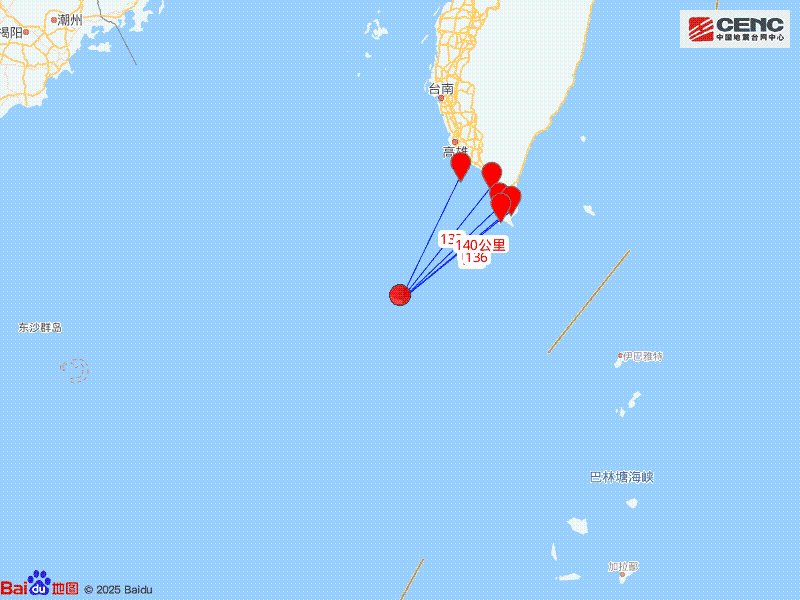 周边县城:震中距台湾恒春镇124公里、距台湾车城乡130公里、距台湾琉球乡132公里、距台湾满州乡136公里、距台湾枋山乡140公里,距台湾高雄市159公里,距台北市456公里。