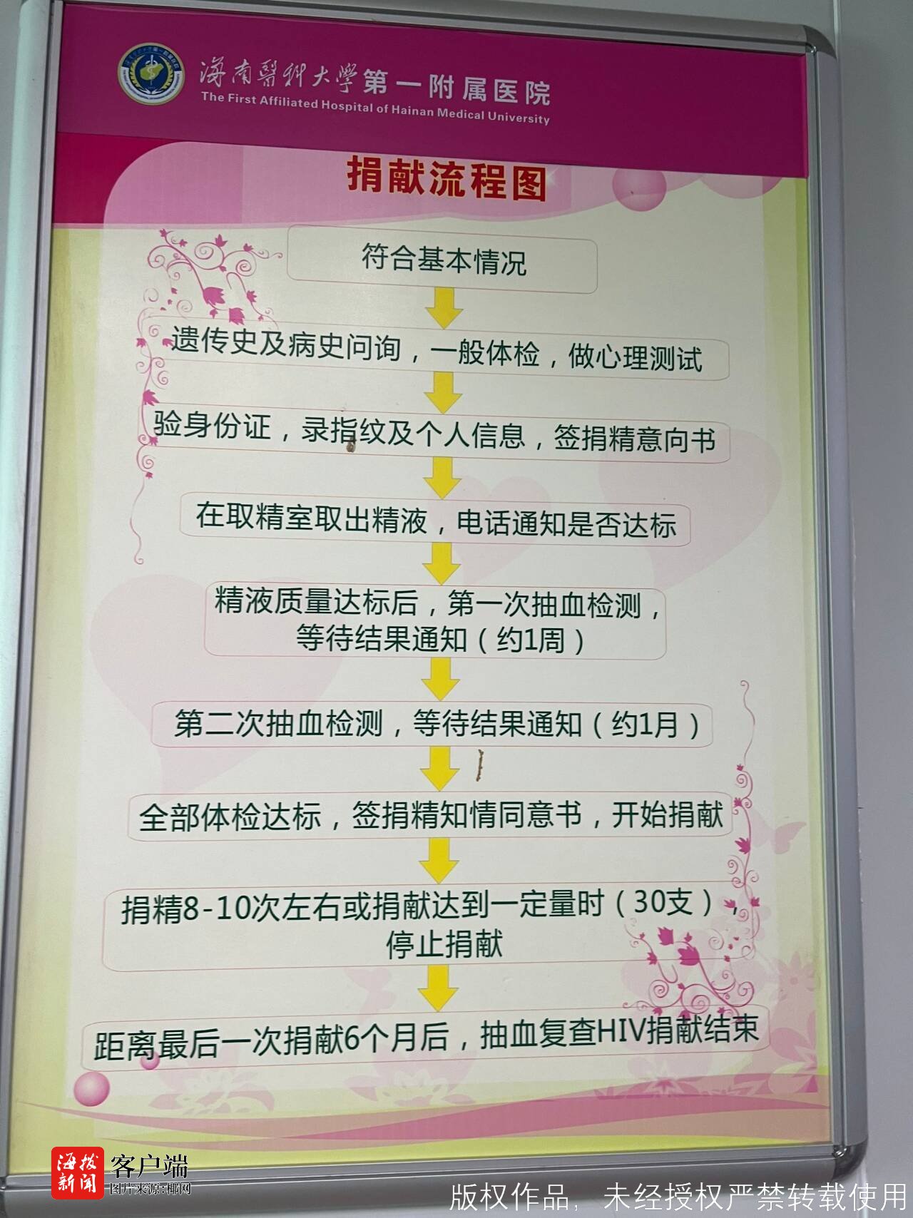记者注意到,海南省人类精子库有几间科室,包含接待室、取精室、储存室、办公区等。据工作人员介绍,捐精者通过非常严格的体检筛查后,可前往取精室完成取精,随后交给工作人员对这些精子再次进行检查,检查合格之后才会被送往储存室,储存室内有许多高约1米的液氮容器,检验合格的精子就被储藏在零下196度的液氮容器里。此外,记者还了解到,海南省人类精子库目前对捐精志愿者的要求必须是中国公民,年龄在20至45周岁;净身高170厘米以上;要求大专及以上学历;身体健康,无不良嗜好,无传染病及遗传病家族史,无色盲、色弱、高血压、心脏病等。
